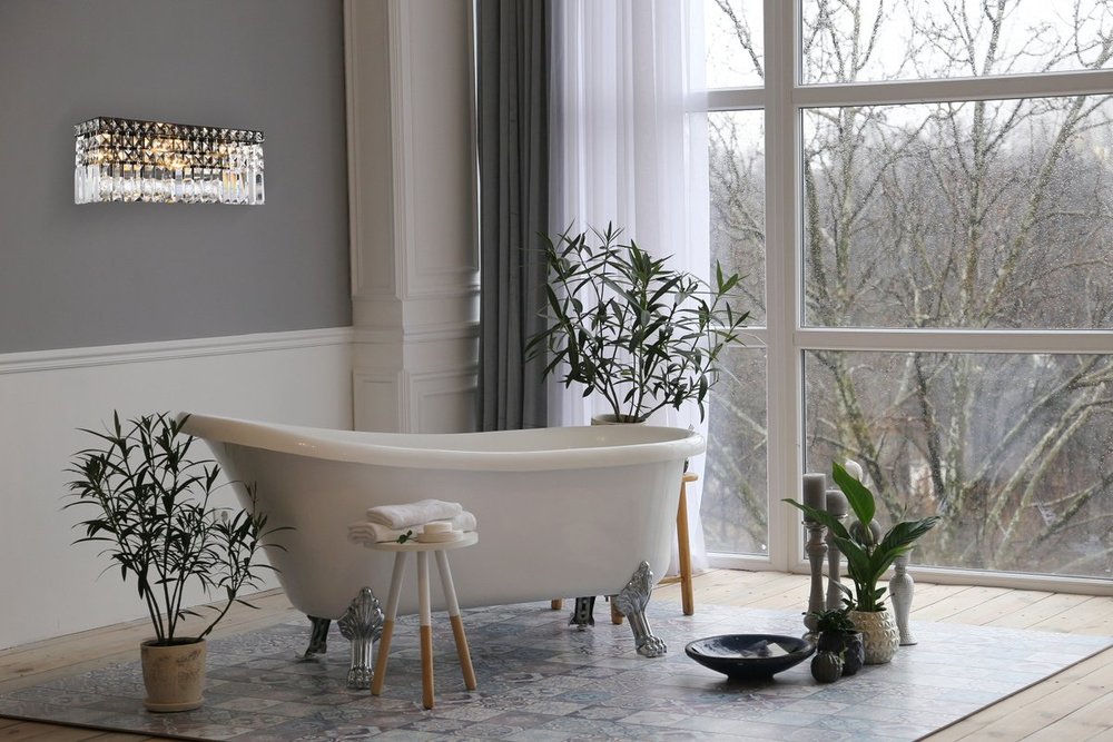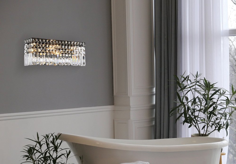 A riot of shapes and textures, Maxime collection wall sconces sparkle in a mosaic of crystal tiles. Square and rectangular precision-cut crystals form the flamboyant semicylindrical or rectangular exterior while faceted crystal balls create a bubbled effect for light to shine through beneath. Available in a black or chrome finish with clear crystals, these lamps are a luxurious addition to a bathroom, entryway, or kitchen.