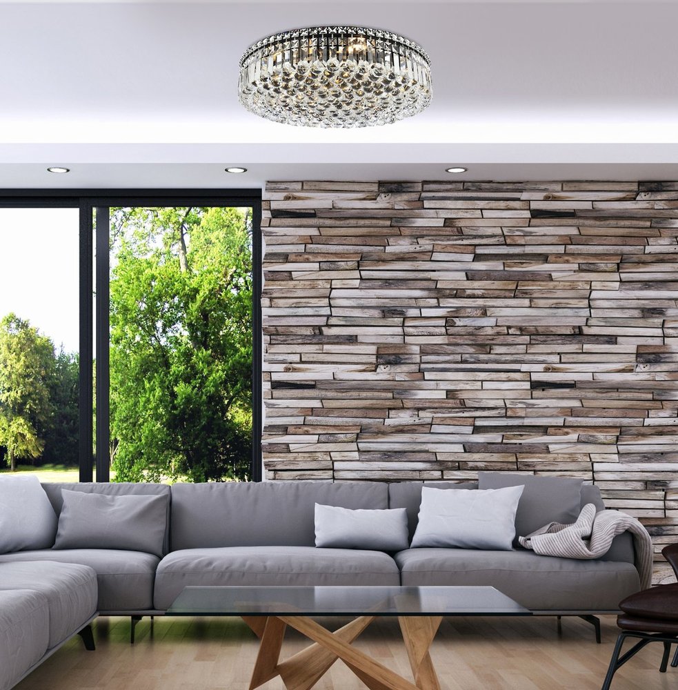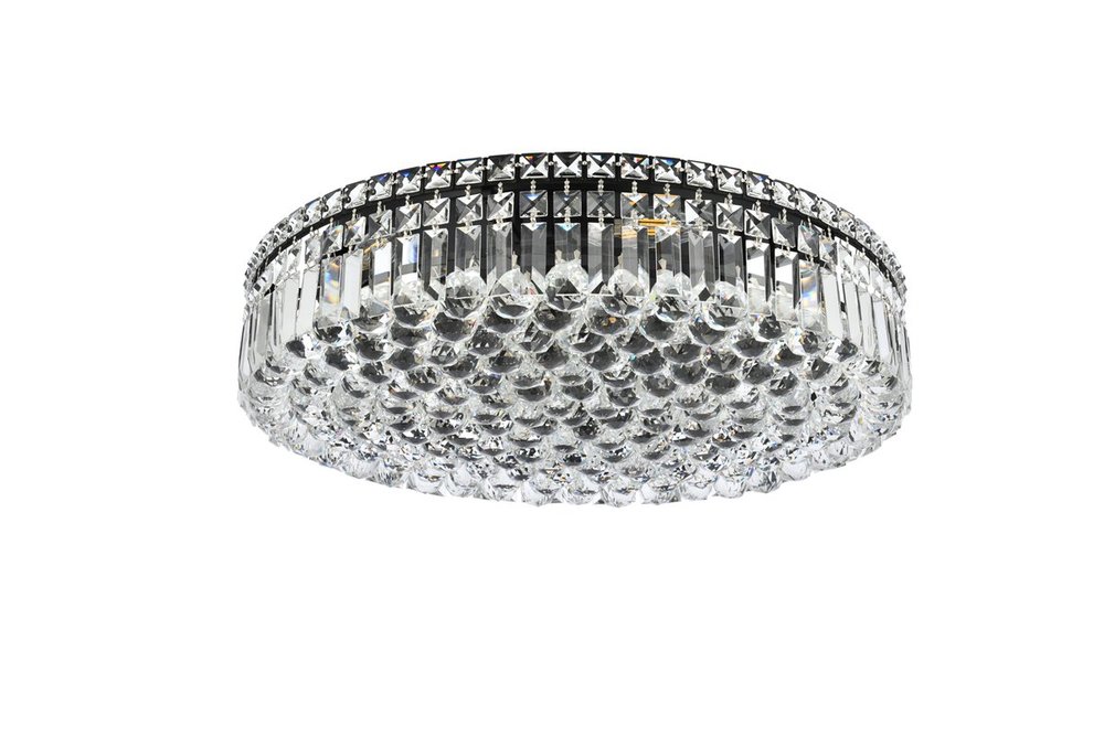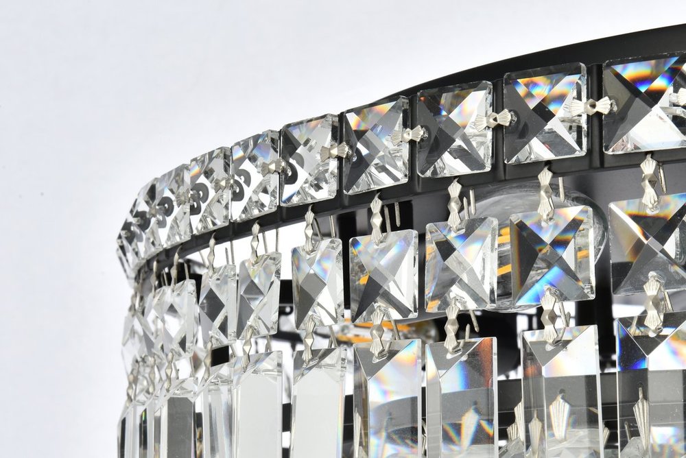 A riot of shapes and textures, Maxime collection flush mounts sparkle in a mosaic of crystal tiles. Square and rectangular precision-cut crystals form the flamboyant exterior while faceted crystal balls create a bubbled effect for light to shine through beneath. Available in a black or chrome finish with clear crystals, these lamps are a luxurious addition to a kitchen, stairwell, foyer, or living room.