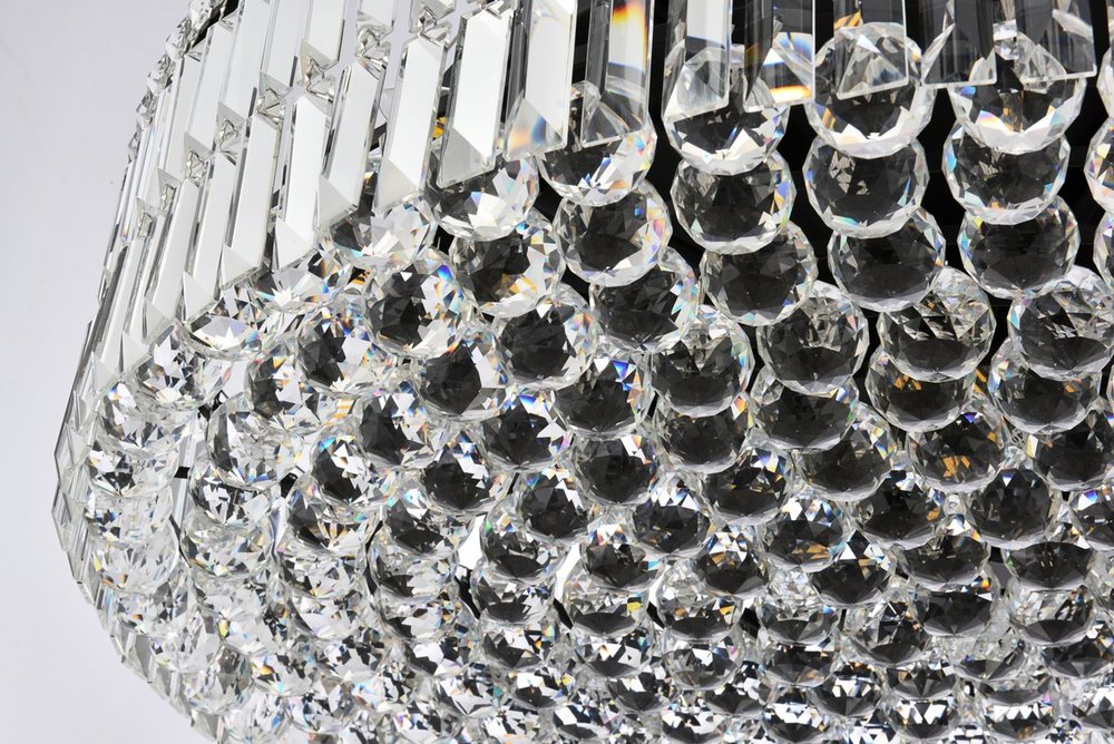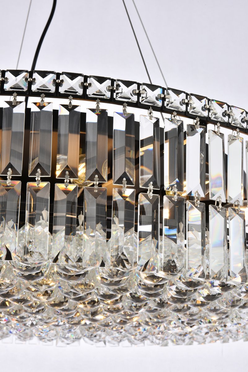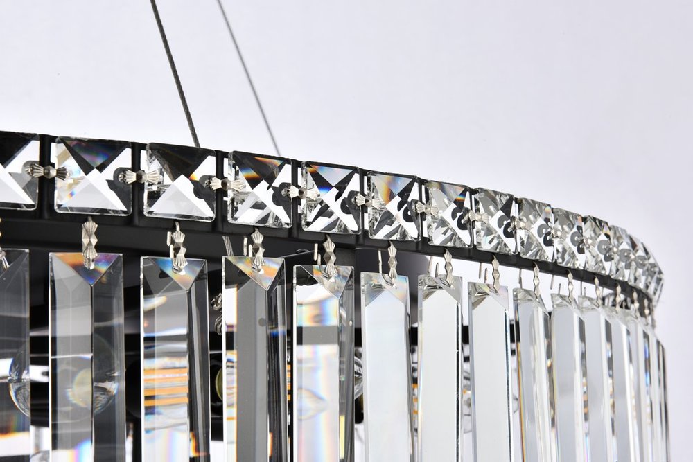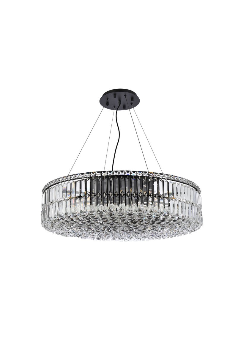 A riot of shapes and textures, Maxime collection hanging fixtures sparkle in a mosaic of crystal tiles. Square and rectangular precision-cut crystals form the flamboyant exterior while faceted crystal balls create a bubbled effect for light to shine through beneath. A mischievous asymmetrical hanging tube adds a touch of whimsy to this structured design. Available in a black or chrome finish with clear crystals, these lamps are a luxurious addition to a dining room, stairwell, foyer, or living room.