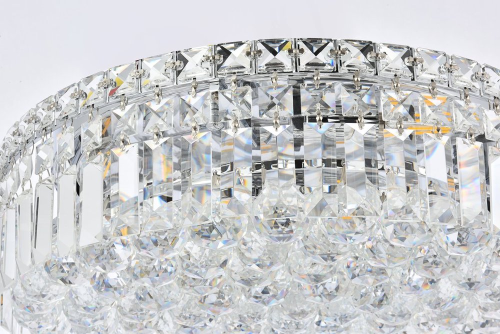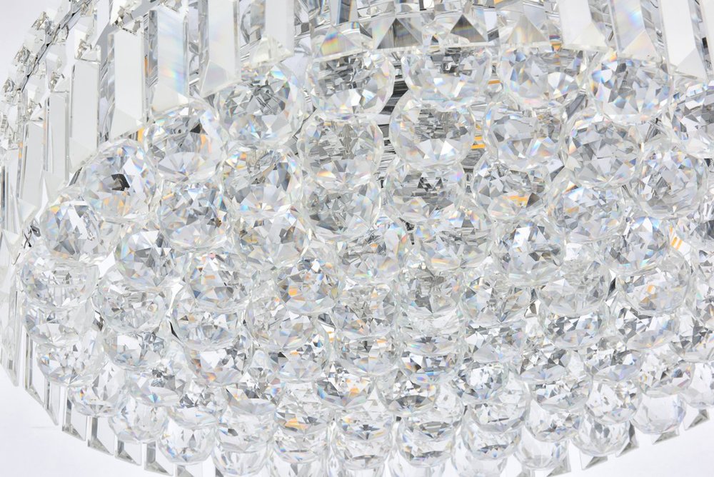 A riot of shapes and textures, Maxime collection flush mounts sparkle in a mosaic of crystal tiles. Square and rectangular precision-cut crystals form the flamboyant exterior while faceted crystal balls create a bubbled effect for light to shine through beneath. Available in a chrome finish with clear crystals, these lamps are a luxurious addition to a kitchen, stairwell, foyer, or living room.