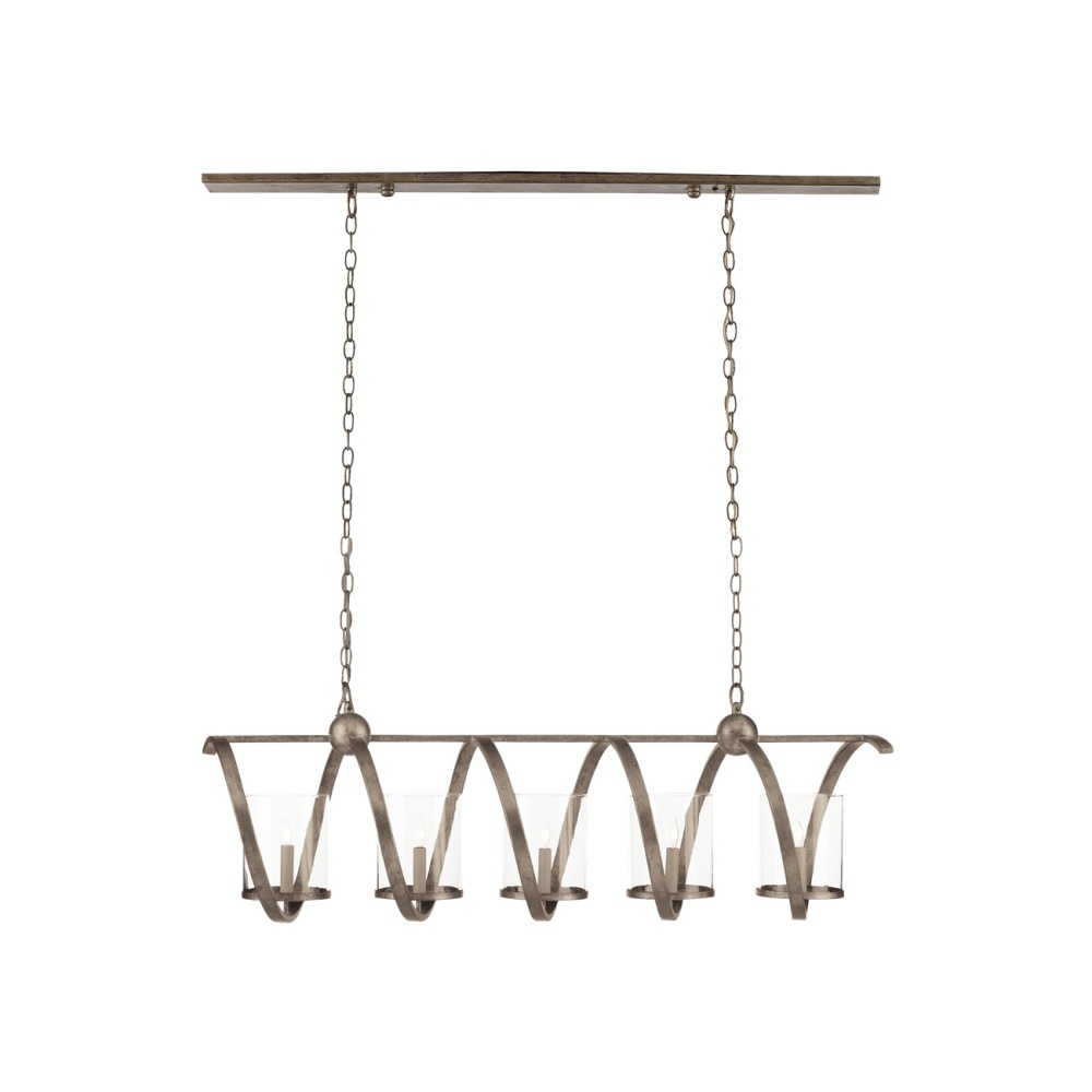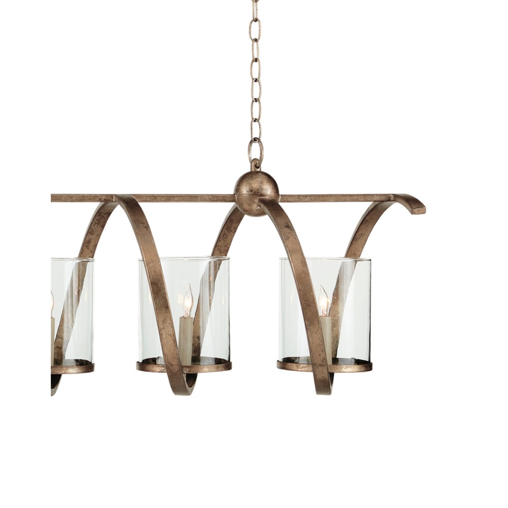 If the Maximus Rectangular chandelier in bronze had its very own lyrics, it would be singing here we go loop de loop! Its wrought iron spirals hold beautiful seeded glass shades perfectly on key. The metal on the fixture has a rich Pyrite bronze finish that has been mottled for a slight textural feel. There is also a Maximus with a washed gold leaf finish.