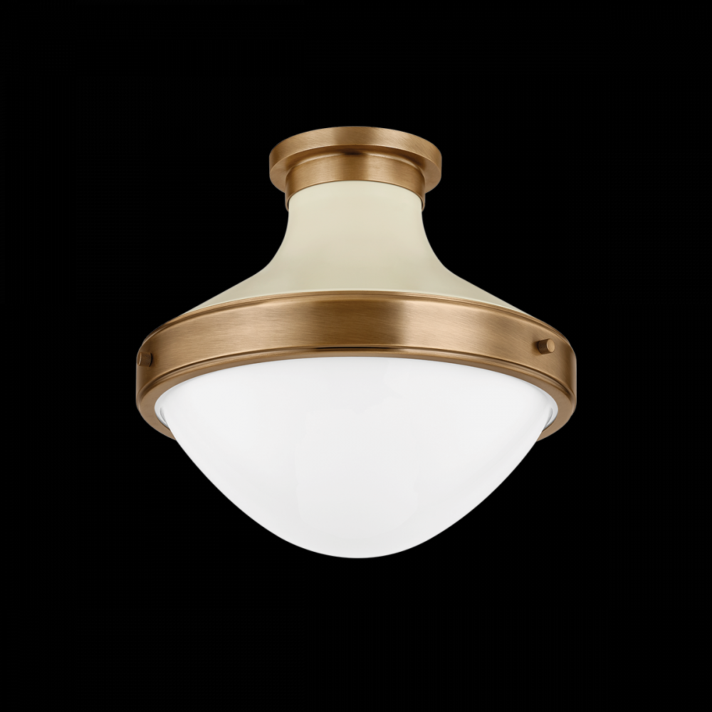 Mixed finishes and industrial details create dynamic contrasts in this elevated basic. A gently sloping Patina Brass and Soft Sand shade supports a rounded opal shiny glass diffuser. When the light filters through, the metalwork gleams with warmth. Available as a flush mount or a pendant in two sizes.