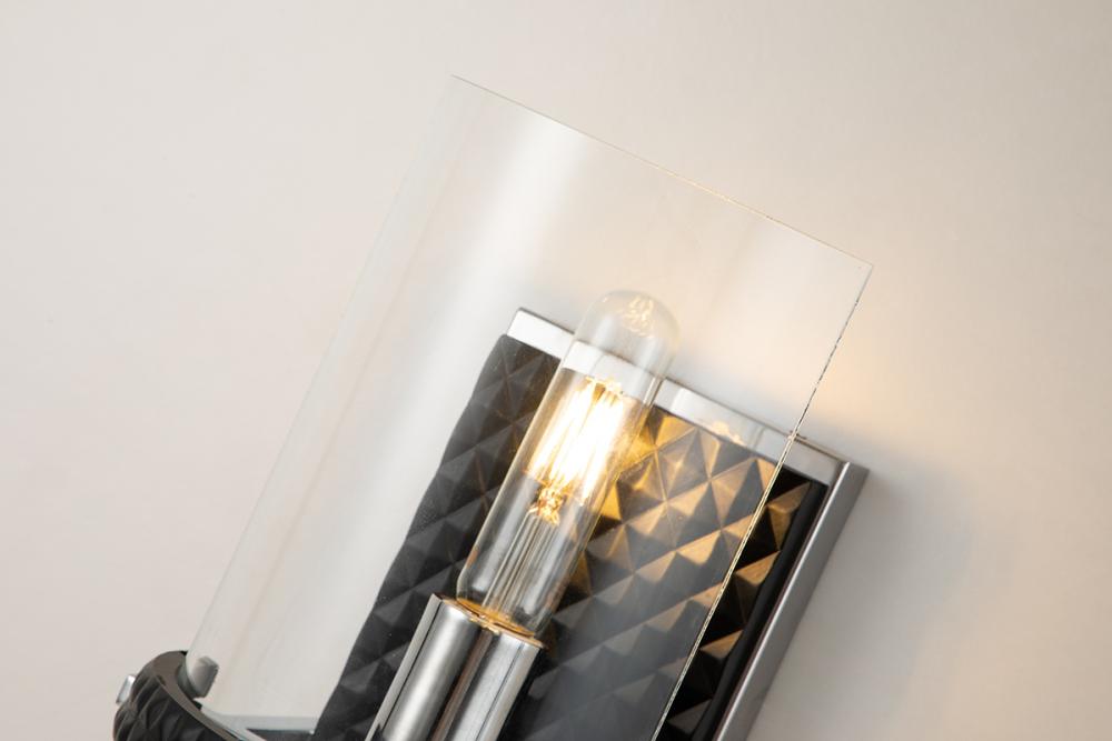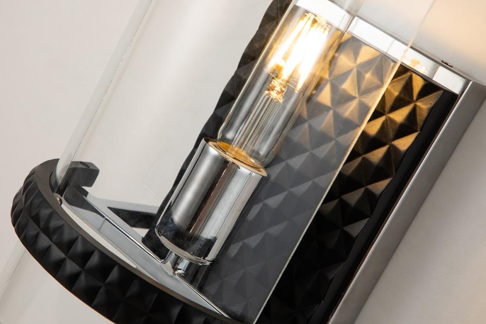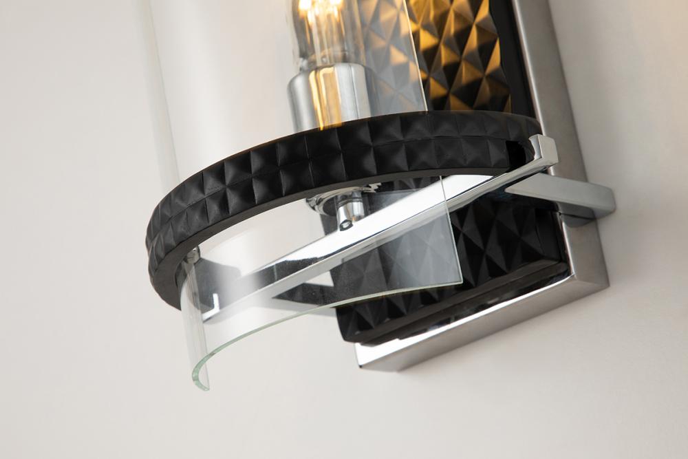 An 8.25" x 10.5" x 7" sconce in black and chrome with a half-drum glass shade. Its textured backplate adds edgy style, perfect flanking mirrors or lighting halls.