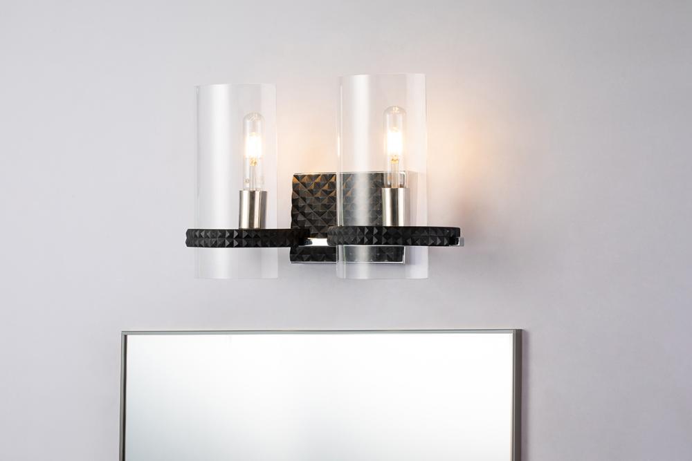 An 18.5" x 10.5" x 7" 2-light vanity in black and chrome with half-drum glass shades. Its textured backplate offers edgy style, ideal over mirrors in any space.