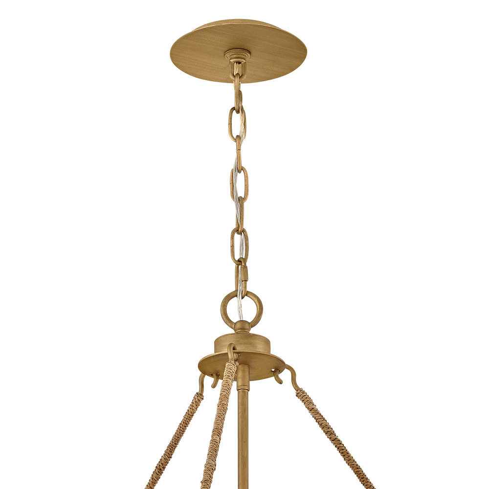 Introduce an element of natural texture and bohemian style to your living space. Tula’s artisan-crafted basket shade is hand-strung with draped strands of coco beads, creating a sheer curtain through which the warm light shines across your room. A hand-painted transitional frame suspended from decorative arms wrapped in natural fiber rope features a Burnished Gold finish with brushed distressed detailing that adds visual depth to the design.