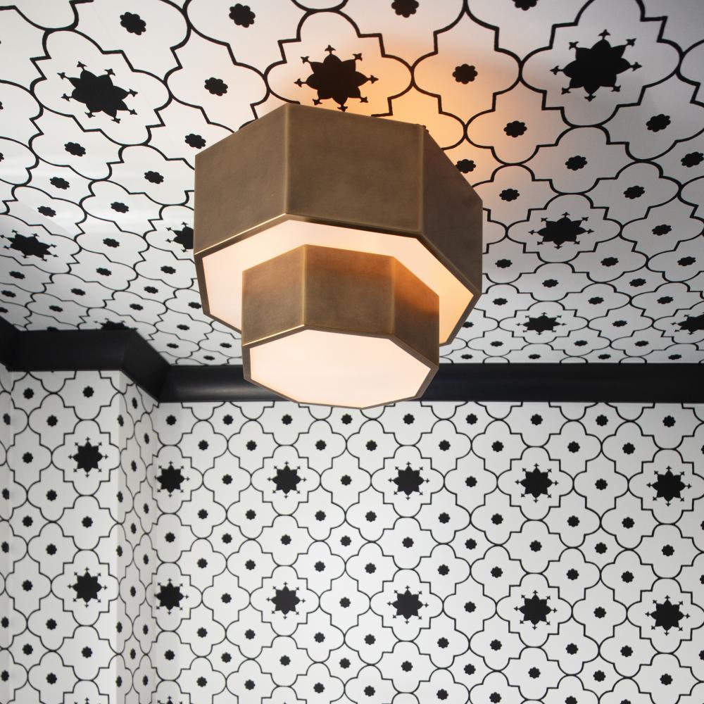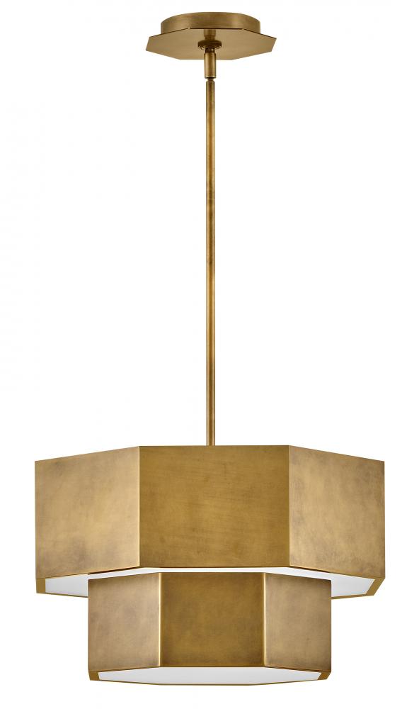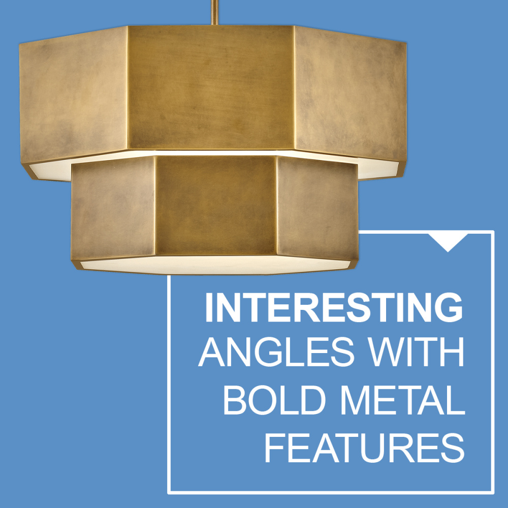 View the many sides of Facet. Interesting angles combine with bold metal features to create an edgy and contemporary profile that is unpretentious yet unforgettable. Hexagonal etched glass is showcased by Heritage Brass or Black Oxide finishes.