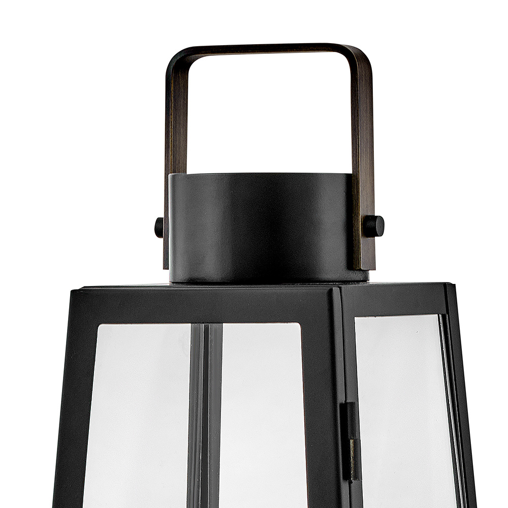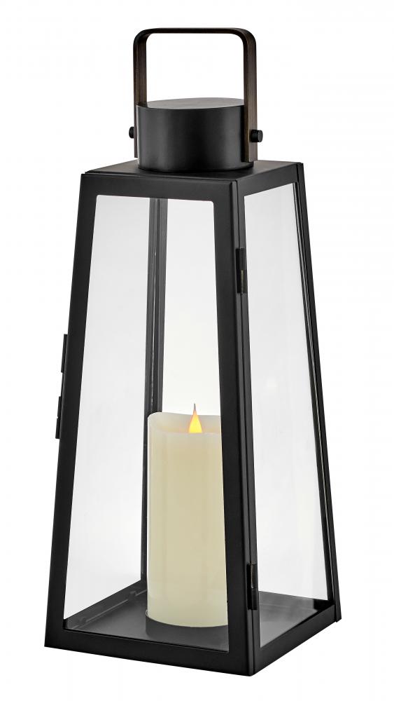 Hype up your alfresco area with the Hugh Decorative Lantern and its sleek, transitional style. The trapezoidal design features bold, over-scaled clear glass panes paired with a bold metal frame to inject a modern edge. With this decorative lantern, you can take the light where you need it, whether that's on a porch, a screened-in patio, or next to an inside fireplace. With an LED faux flame wick candle included, it's easy to make Hugh pop inside or out, with no electrical wiring required.