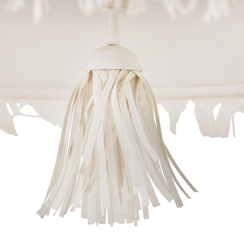 Taking a nod from current distressed fashions, Baya’s soft, hand-sewn patchwork shade creates a light and elegant feeling. Its coastal cottage style and chic texture make an artsy transitional statement complemented by a leather tassel, comfortable dimmable lamping, and a Textured Plaster finish.