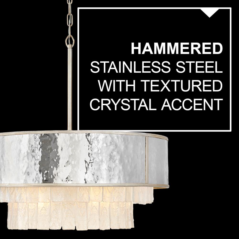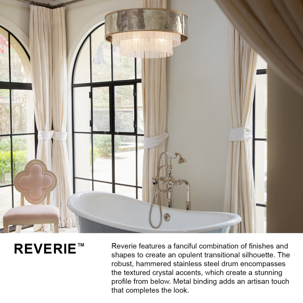 Reverie features a fanciful combination of finishes and shapes to create an opulent transitional silhouette. The robust, hammered stainless steel drum encompasses the textured crystal accents, which create a stunning profile from below. Metal binding adds an artisan touch that completes the look.