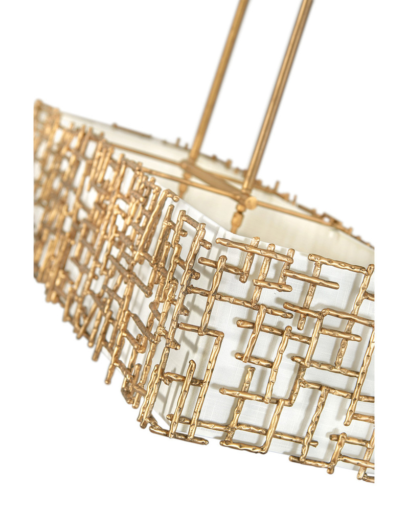Farrah's contemporary design is bold and sculptural, while achieving an optical airiness. The hand-hammered crosshatch bars gleam in a hand-applied Silver Leaf or Burnished Gold finish with artisanal detailing that carries through to the canopy detail. Set against a White Linen shade, Farrah creates a look of deconstructed; modern elegance.