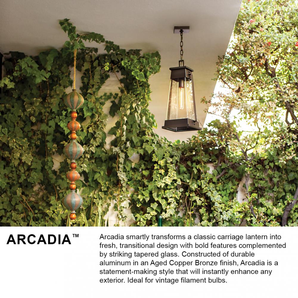 Arcadia smartly transforms a classic carriage lantern into fresh, transitional design with bold features complemented by striking tapered glass. Constructed of durable aluminum in an Aged Copper Bronze finish, Arcadia is a statement-making style that will instantly enhance any exterior. Ideal for vintage filament bulbs.