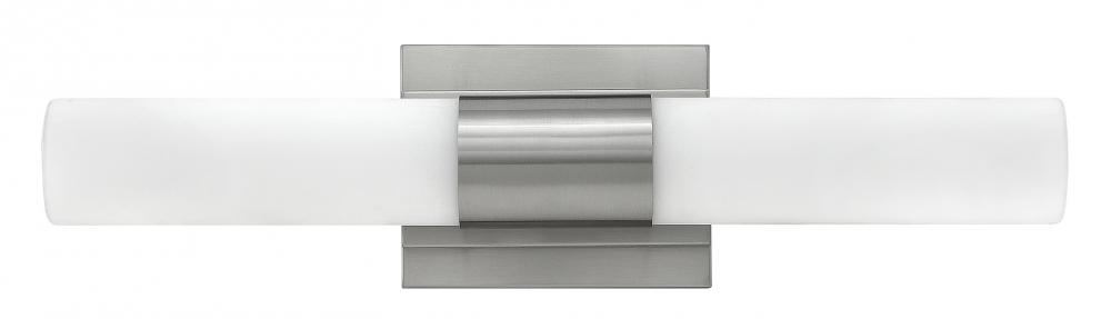 Portia's slim profile unifies design and technology. A pair of blown etched opal glass cylinders extends from a center metal fixture body, creating a streamlined cylindrical form. Finished in either Brushed Nickel or Polished Nickel, this eco-efficient linear LED collection is fully dimmable and provides even, warm white light. The raceway back plate and optional junction box cover plate provide multiple mounting opportunities.