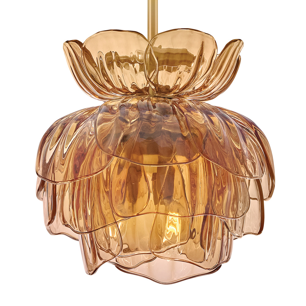 Fantine’s flowing blooms are inspired by preserved flowers suspended in time. Uniquely shaped artisan-sculpted glass arranged in lush layers creates an ethereal dance of light and shadow. An exaggerated canopy and slender stems are crafted from solid brass in a hand-touched Unlacquered Brass finish.