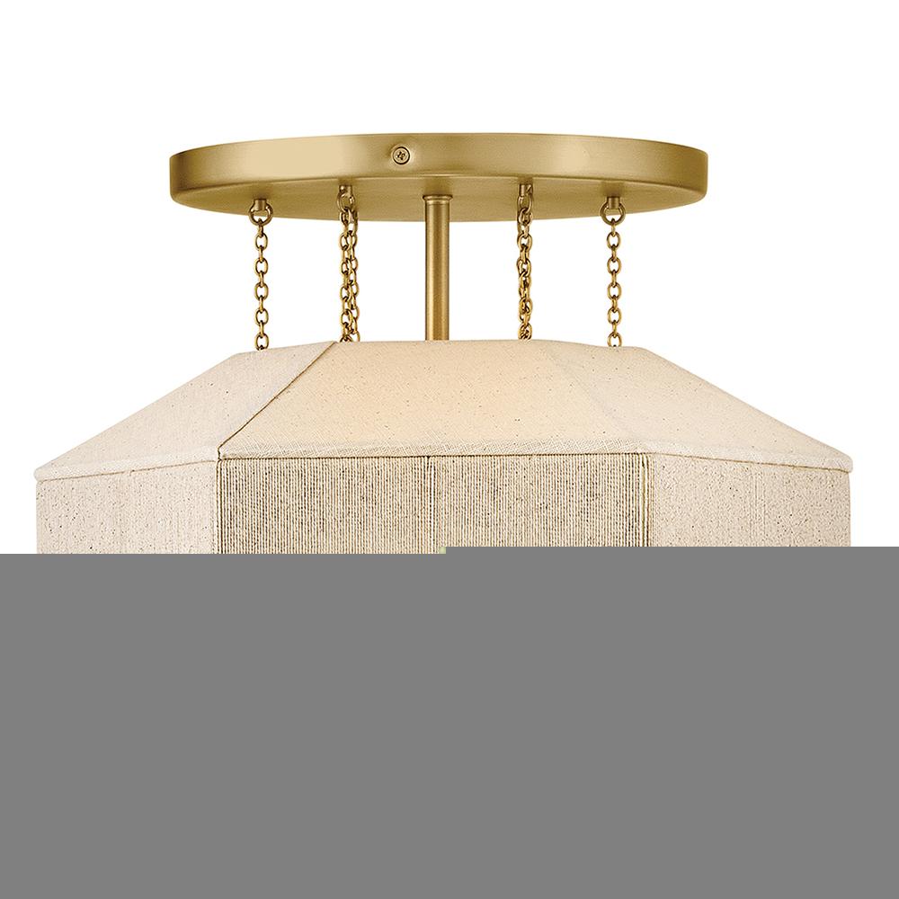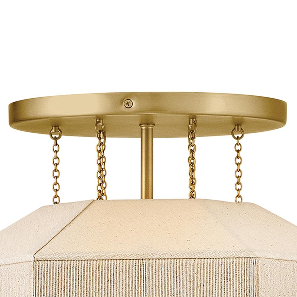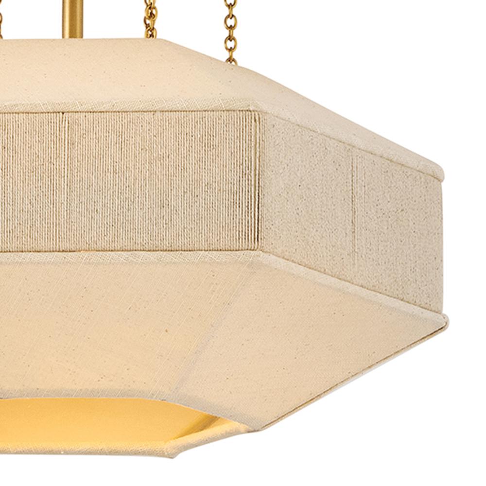 Elegant yet edgy, Lyla’s geometric Oatmeal Linen shade with a textured, wrapped middle band is suspended from refined Lacquered Brass micro-chains – inspired by delicate jewelry designs. A Lacquered Brass canopy and dimmable lamping add subtle warmth and a sophisticated atmosphere to the surrounding space.