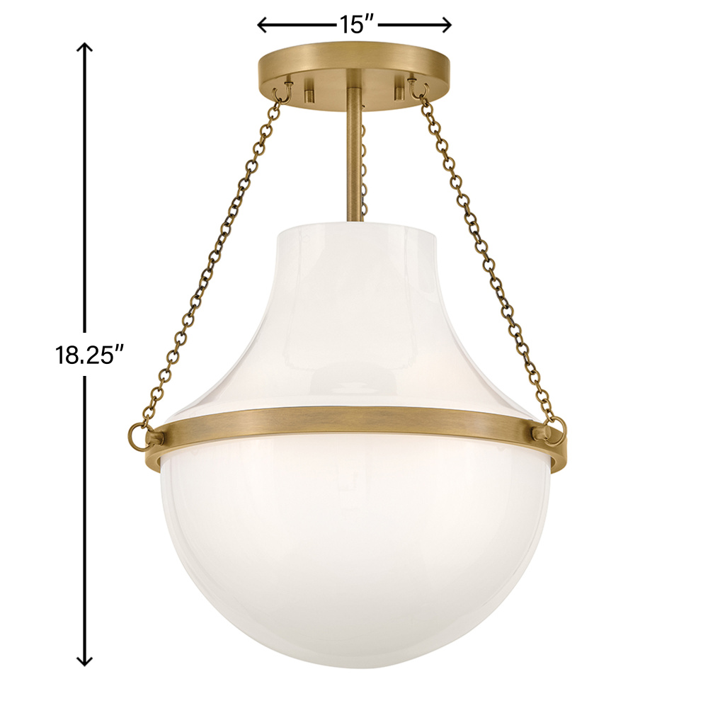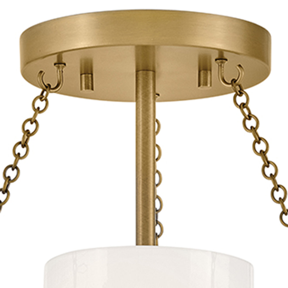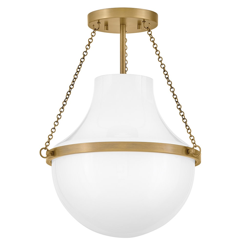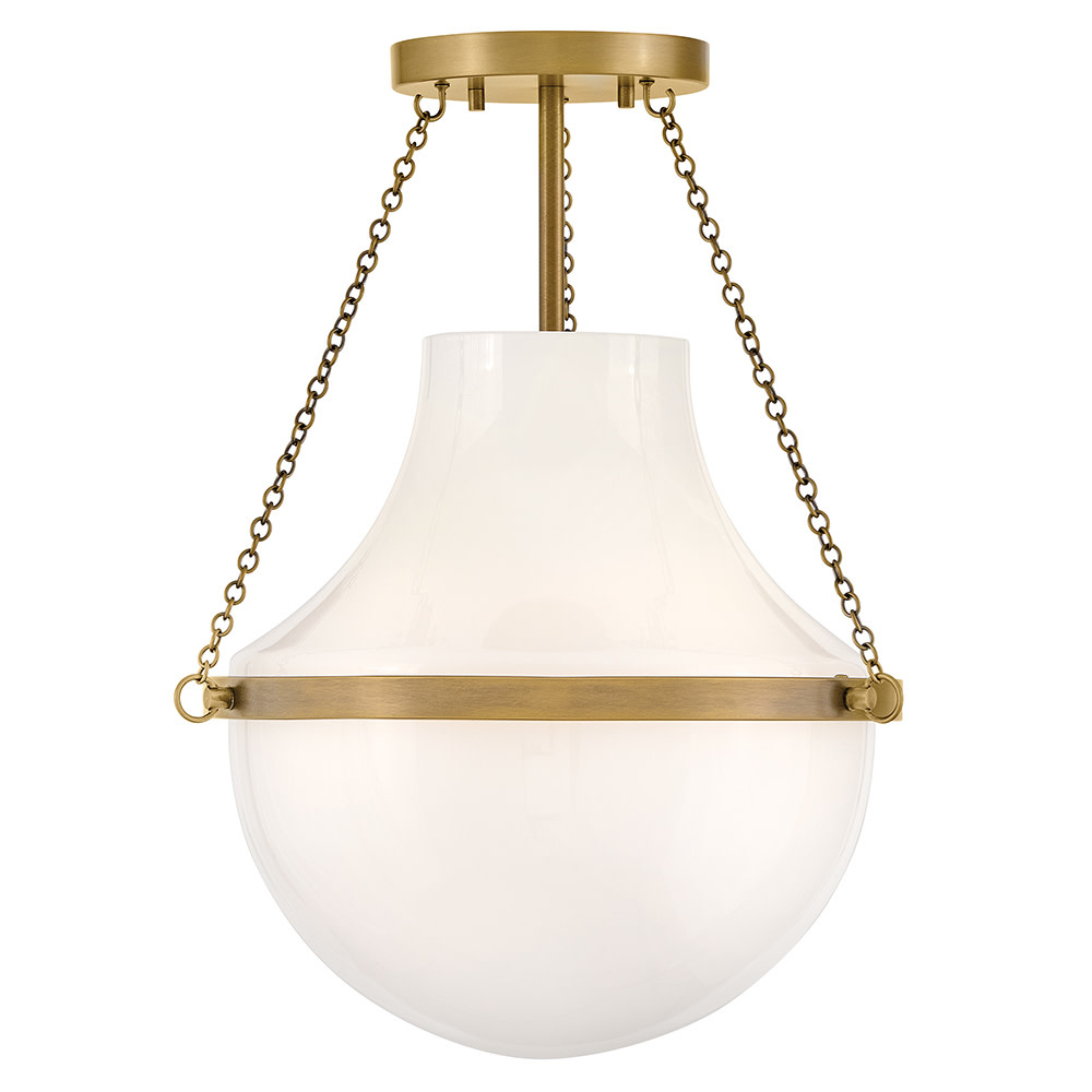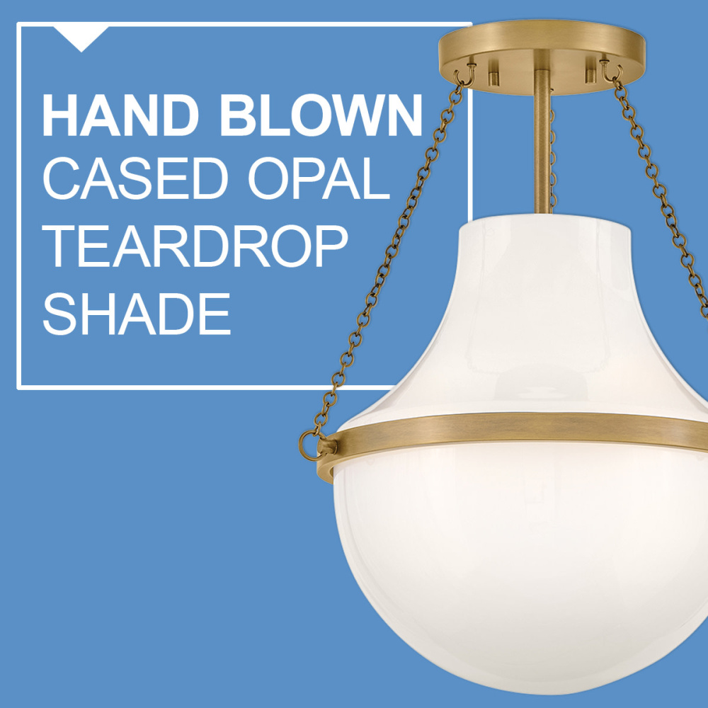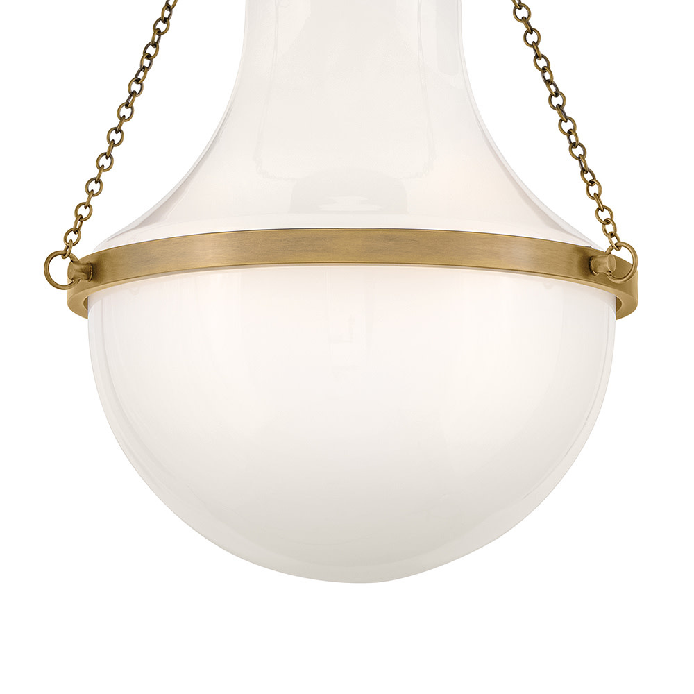 Fusing a sculpted, modern form with classically styled details, Collins features a transitional teardrop shade crafted from blown, cased opal glass. A central metal band and delicate chain uprights are available in Heritage Brass or Black Oxide finishes.