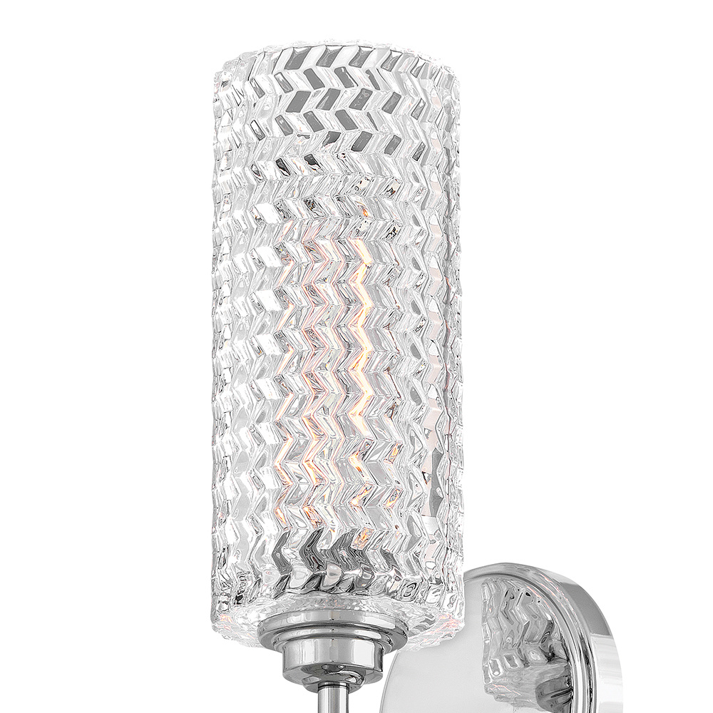 Traditional elegance with a modern edge defines Elle's graceful design. Rich chevron cut glass provides interesting light refraction and is a dramatic focal point whether the light is on or off. The gleaming metal finish adds to the glam design that gives a touch of radiance to any space.
