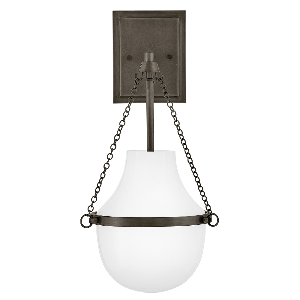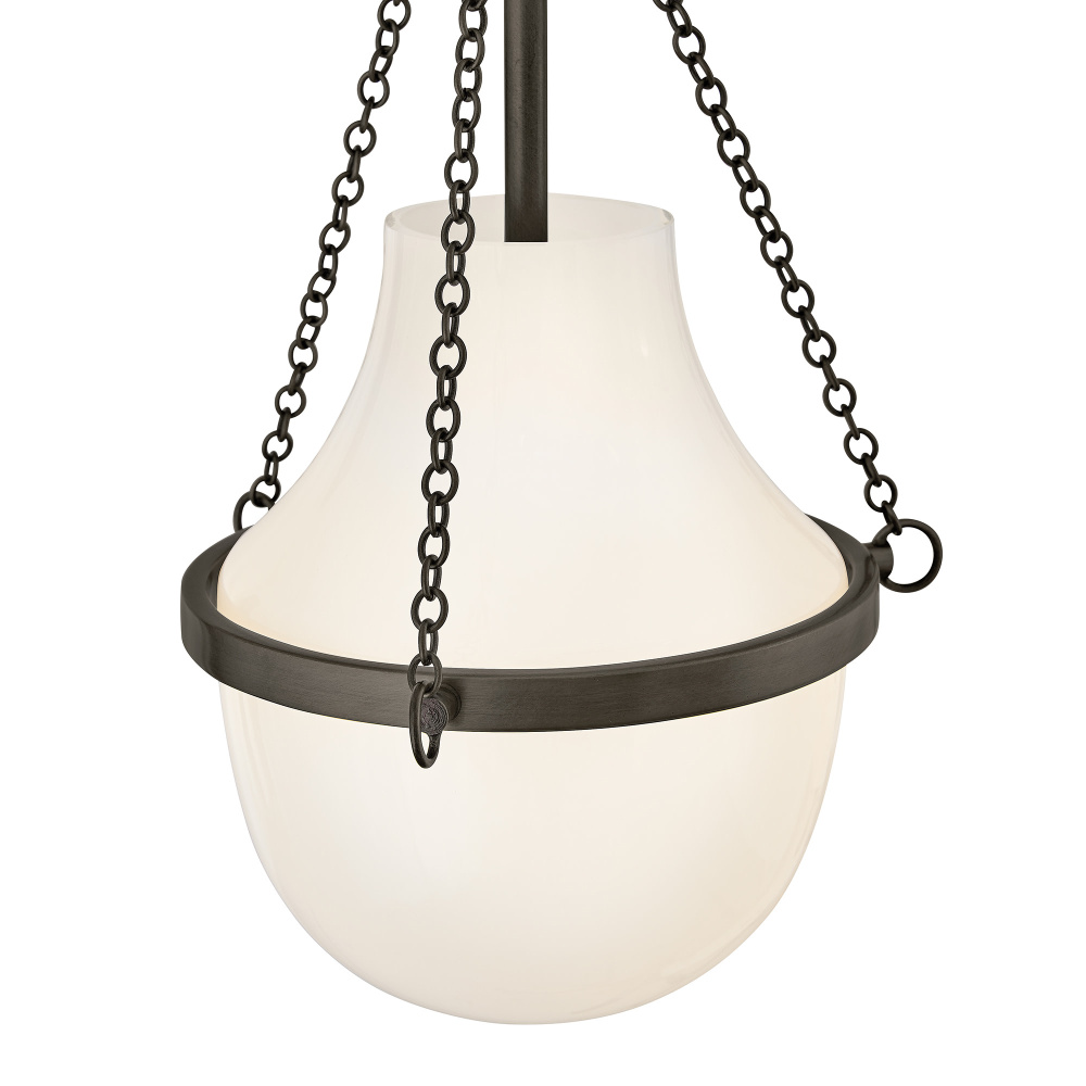 Fusing a sculpted, modern form with classically styled details, Collins features a transitional teardrop shade crafted from blown, Cased Opal glass. A central metal band and delicate chain uprights are available in Black Oxide, Heritage Brass, Heritage Bronze, or Polished Nickel finishes.
