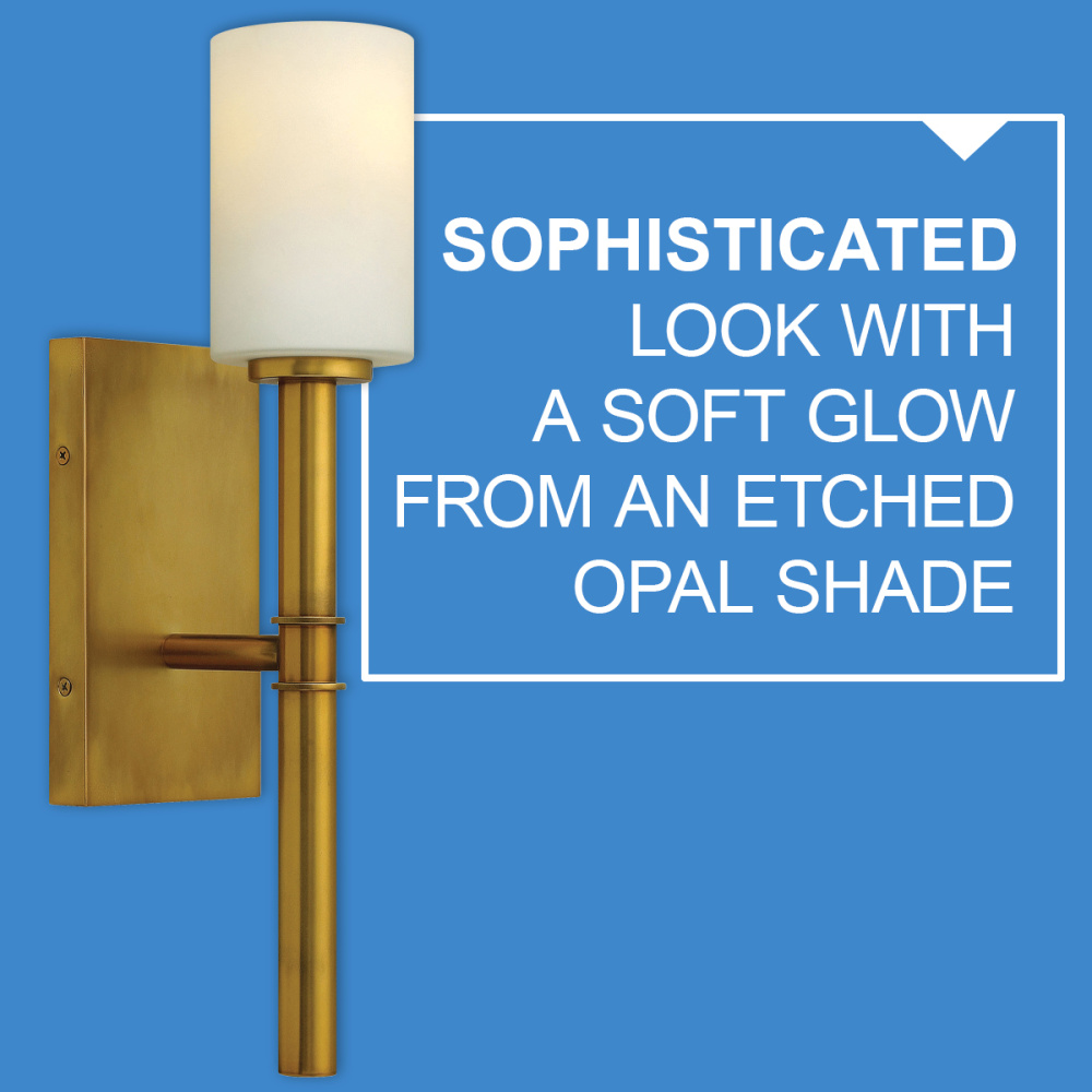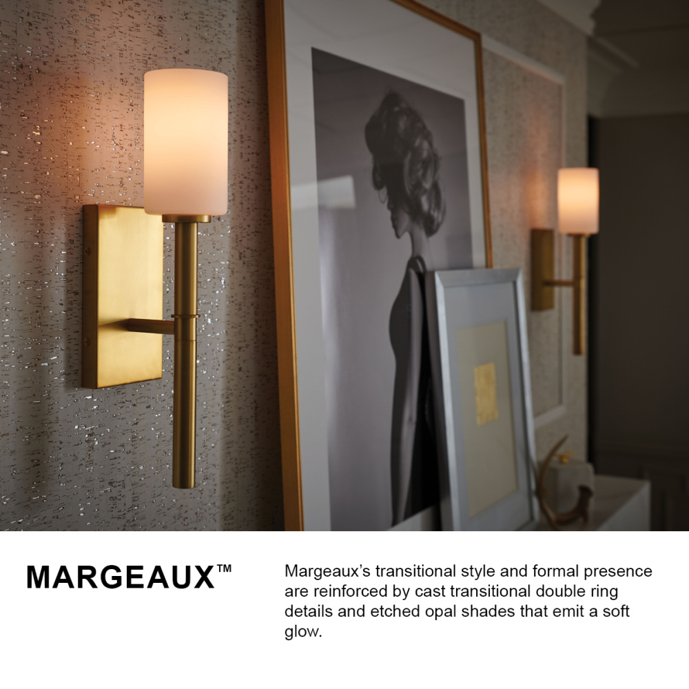 Margeaux's transitional style and formal presence are reinforced by cast transitional raised double ring details and etched opal shades that emit a soft glow.