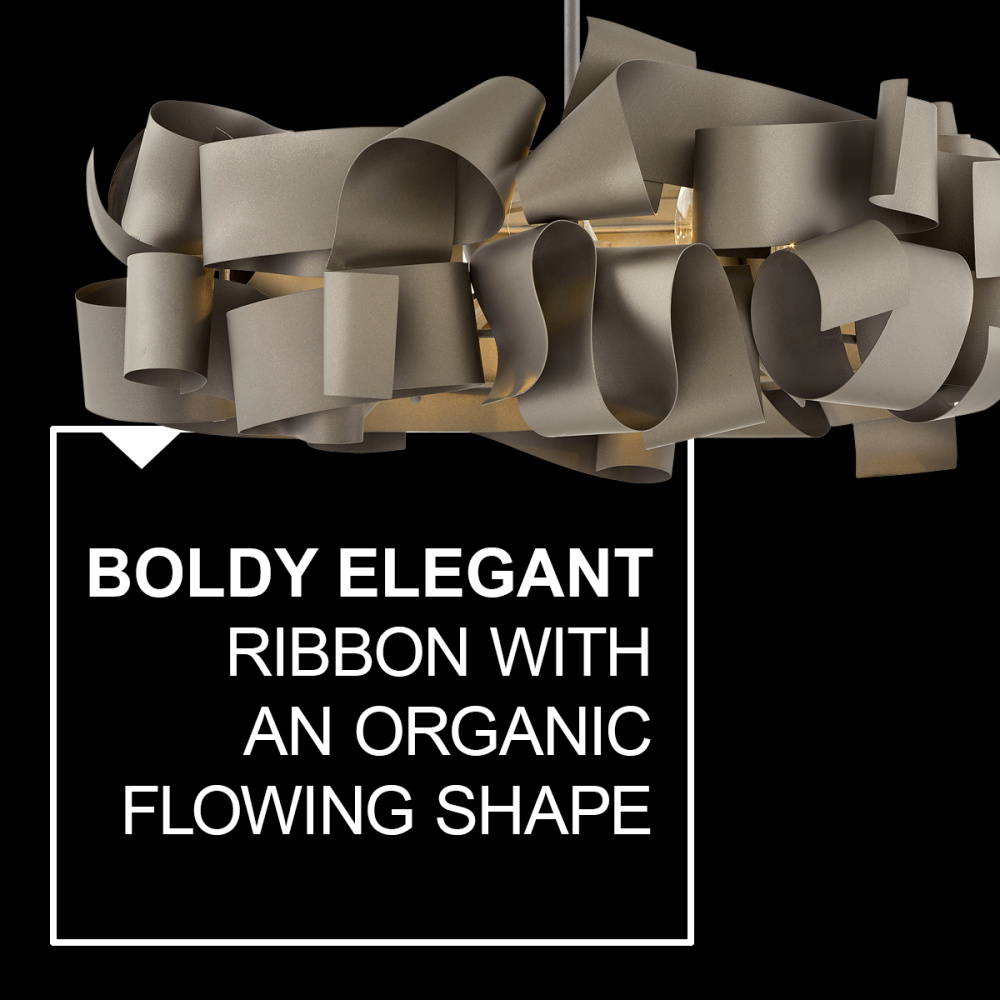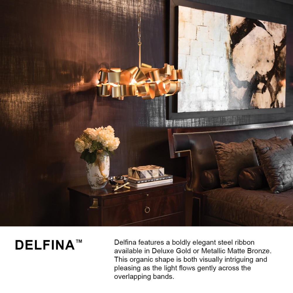Delfina features a boldly elegant steel ribbon available in Deluxe Gold or Metallic Matte Bronze. This organic shape is both visually intriguing and pleasing as the light flows gently across the overlapping bands.