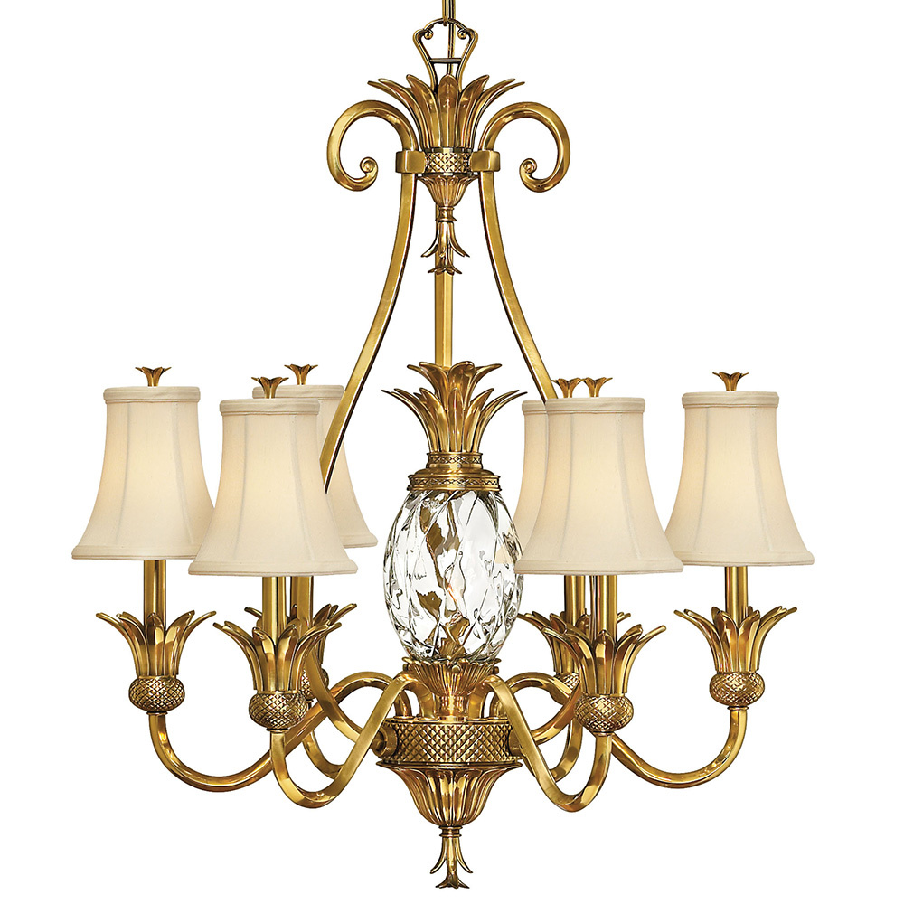 A Hinkley classic, the ornate Plantation collection features exceptional pineapple shaped, clear optic glass that makes a noble statement. The elaborate, decorative cast detailing is accentuated by its lush finish.