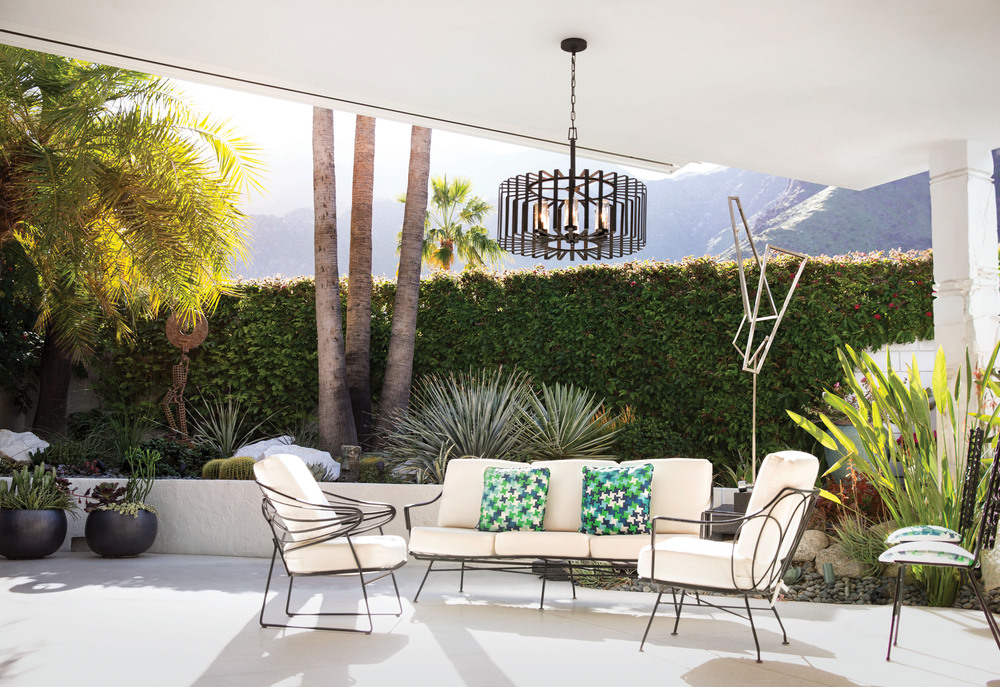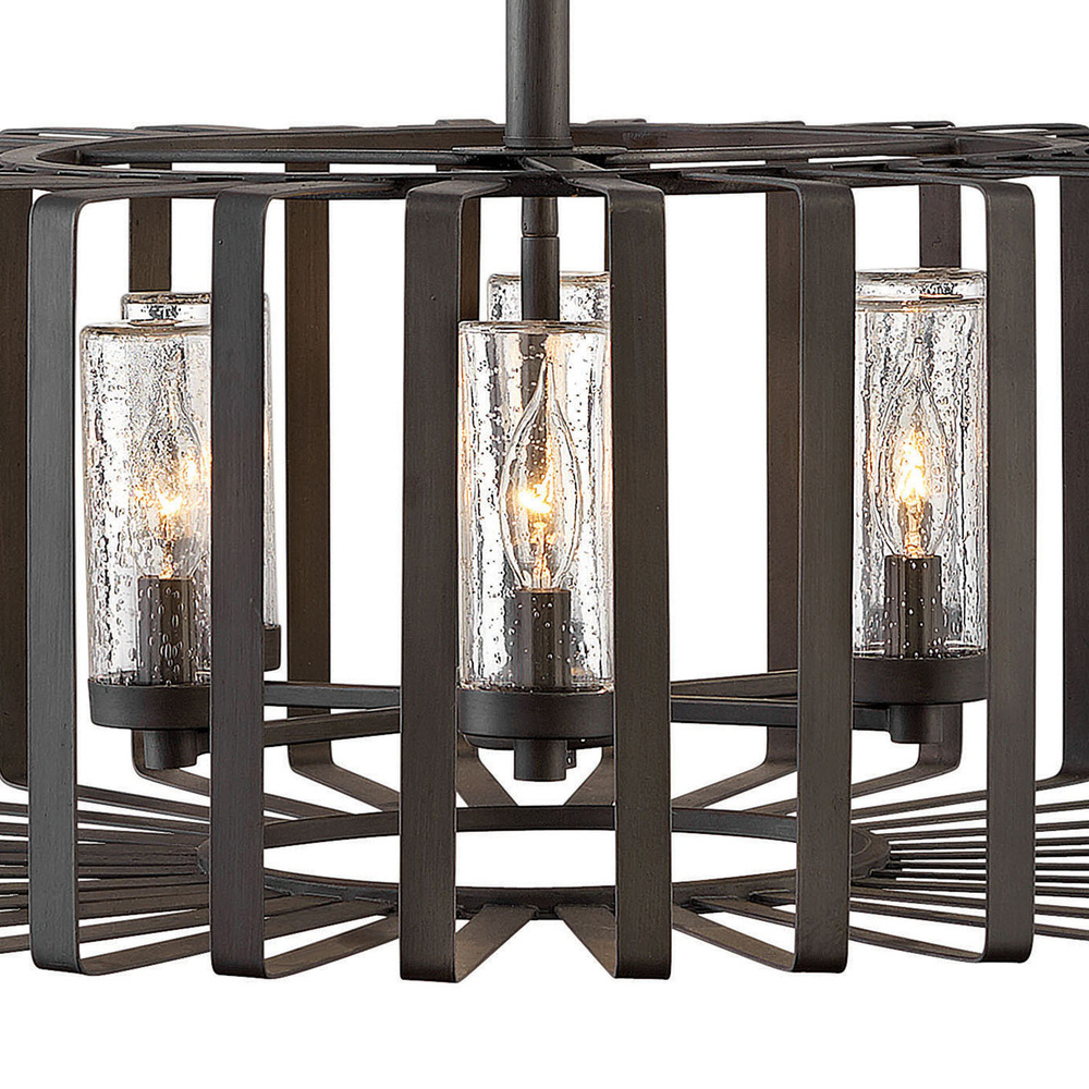 Reid uses an iconic profile featuring an airy, open cage to capture the center of attention. A candelabra with clear seedy glass columns highlights the transitional style, making it a modern mix of classic and contemporary. Weather-resistant metal with a Brushed Graphite finish complements any space, inside or out.