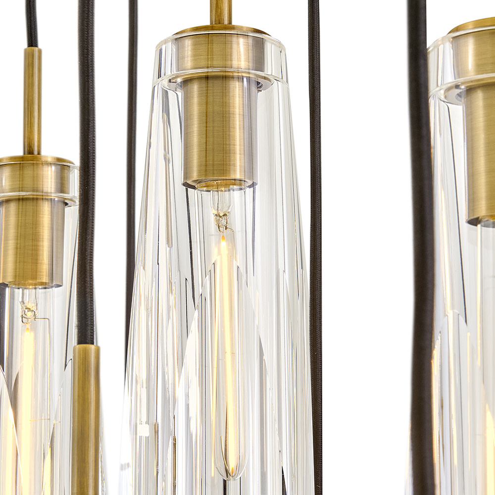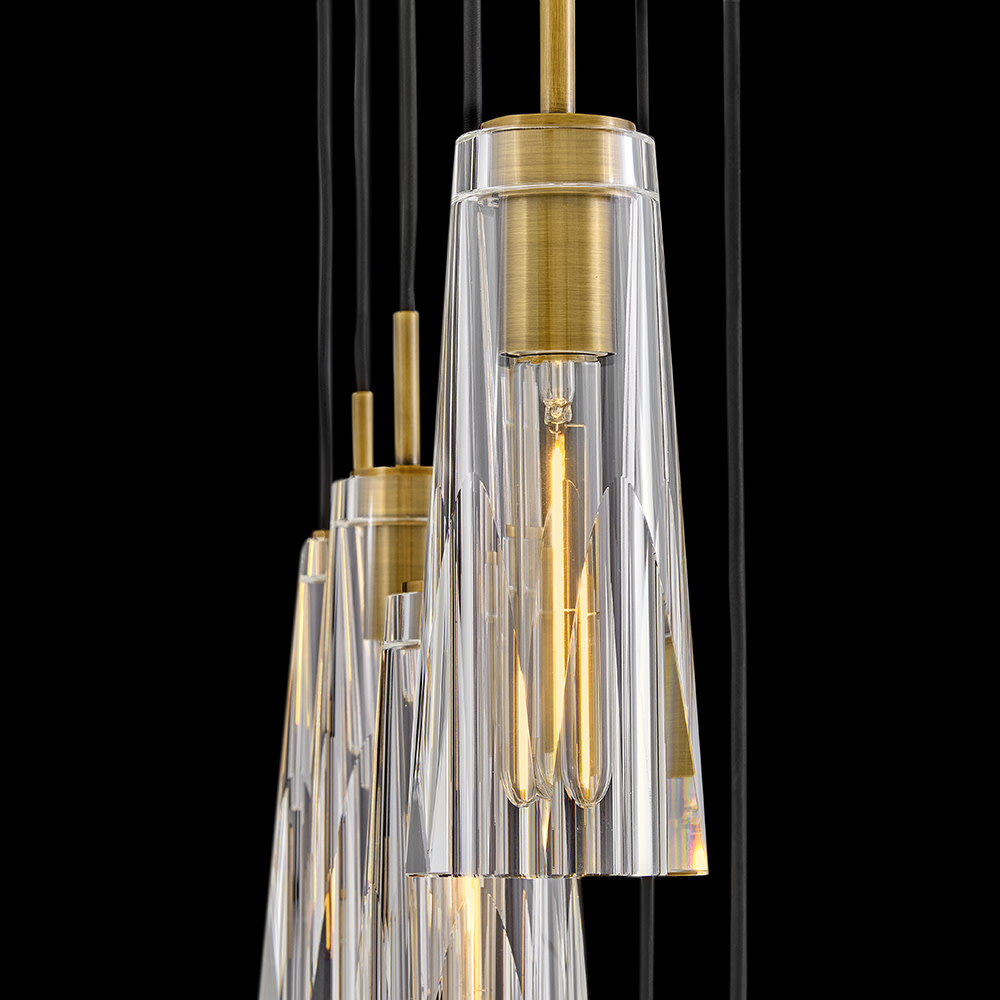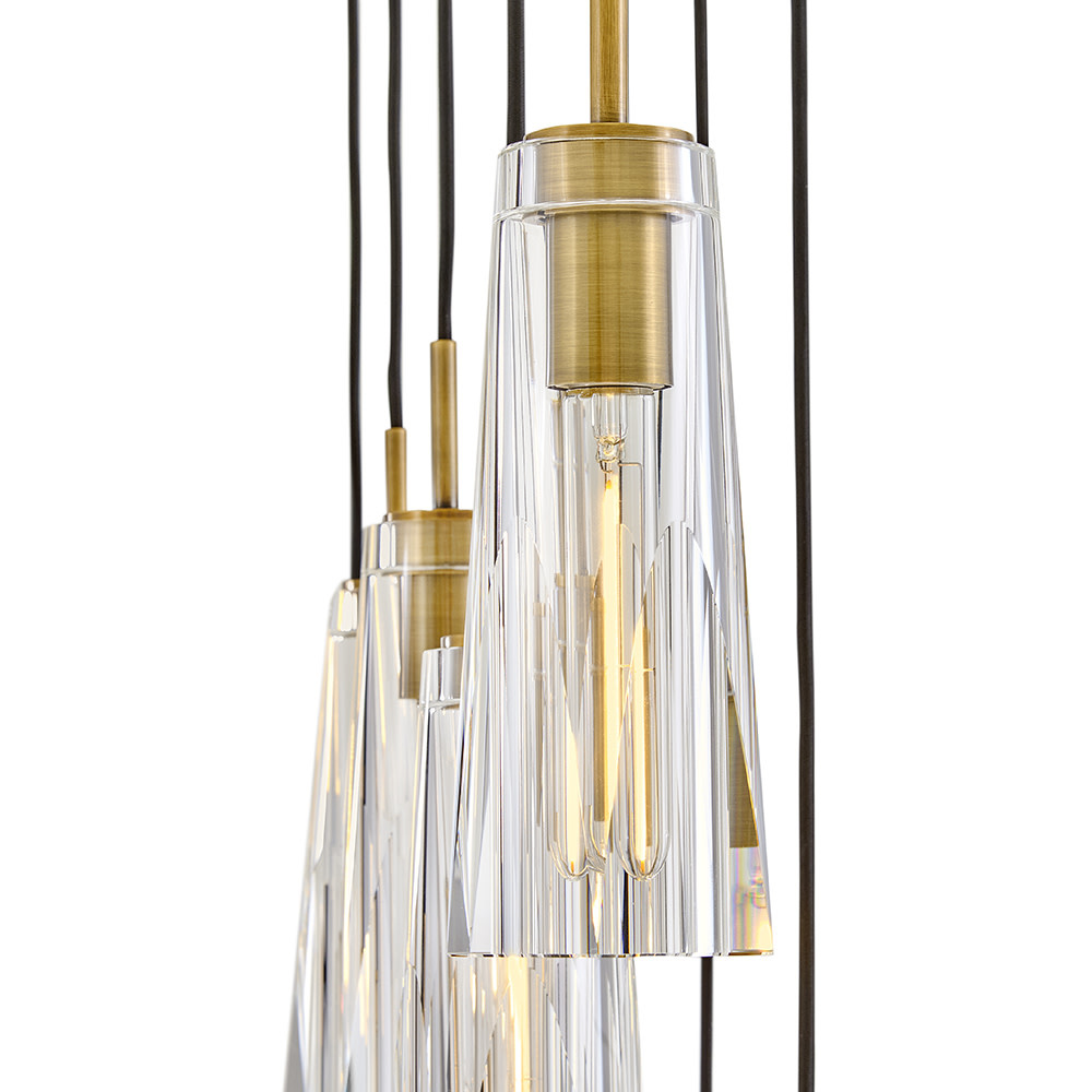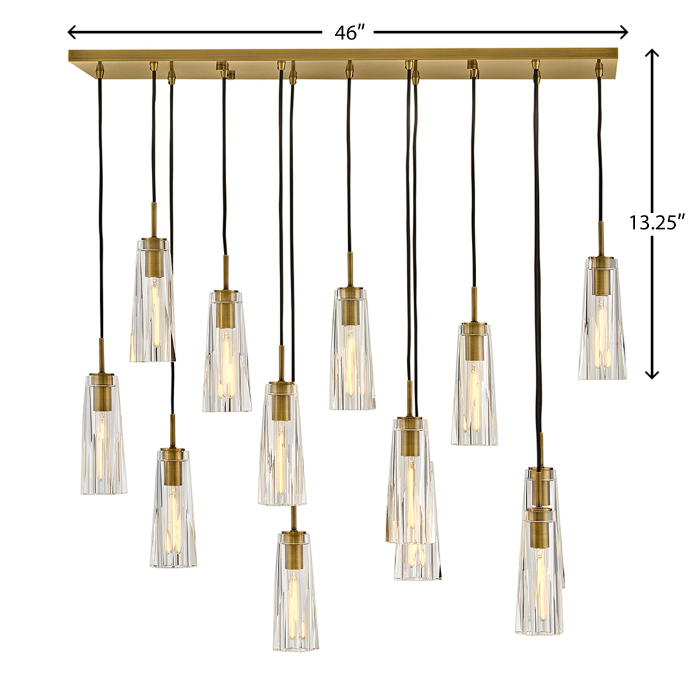 Dramatic and sleek, Cosette exudes opulent charm with an elongated silhouette and luxurious cut crystal. Two luxurious shade options, smokey gray or clear, beautifully cast a rich, multi-faceted light pattern. Adjustable cords designed for easy installation allow you to arrange your fixture to match your space and style.