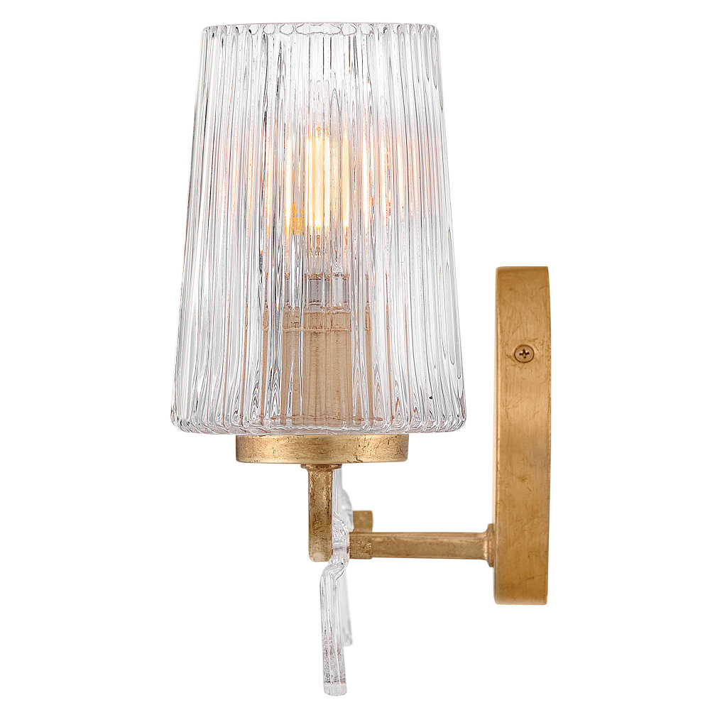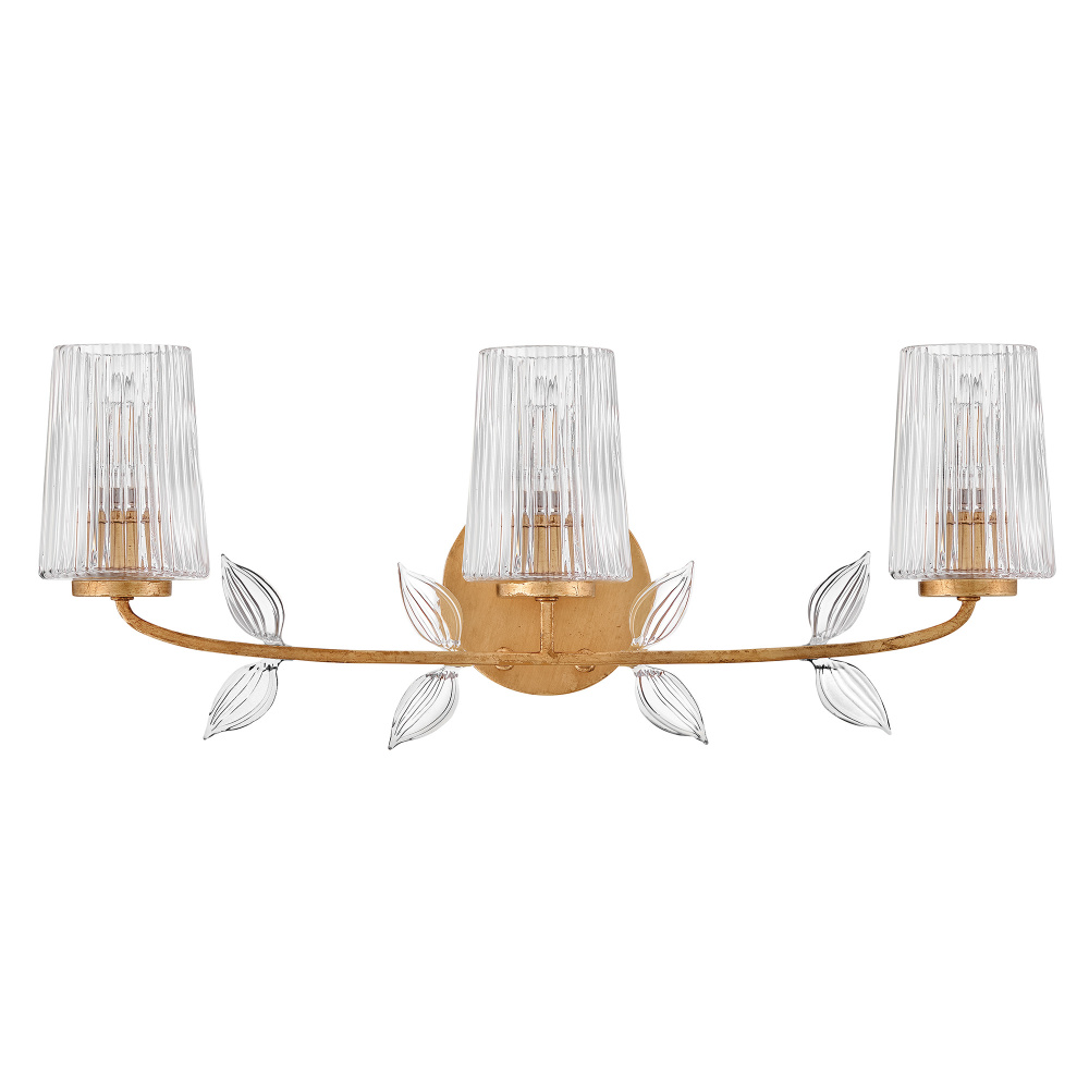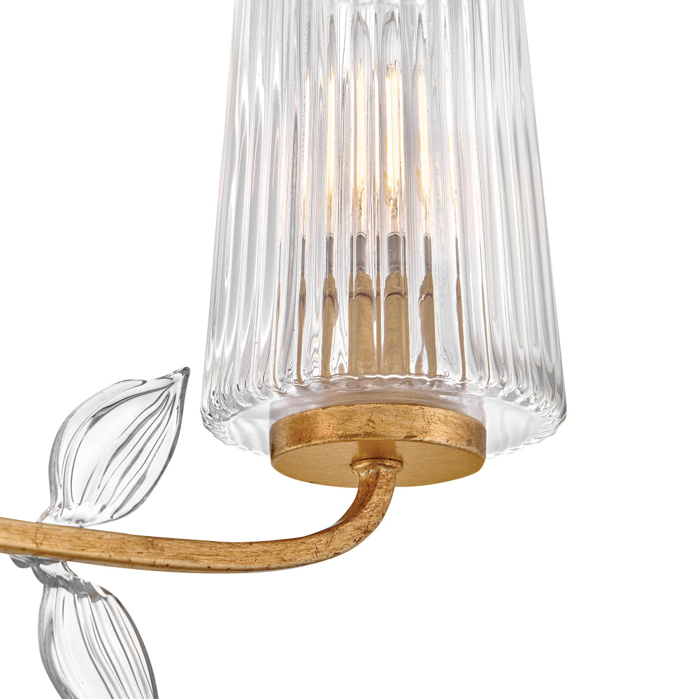 Feminine and romantic, Aliso’s thin, delicate frame is adorned with dainty, clear, pressed glass leaves. A hand-painted Distressed Brass finish enhanced by gold leaf makes a polished and luxurious statement in both traditional and modern settings