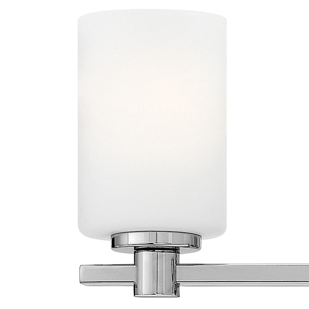 Karlie's clean design is transitional in style and will complement a variety of décor. Featuring precision die-cast cups and cylindrical, etched opal glass, it is available in Brushed Nickel and Chrome.