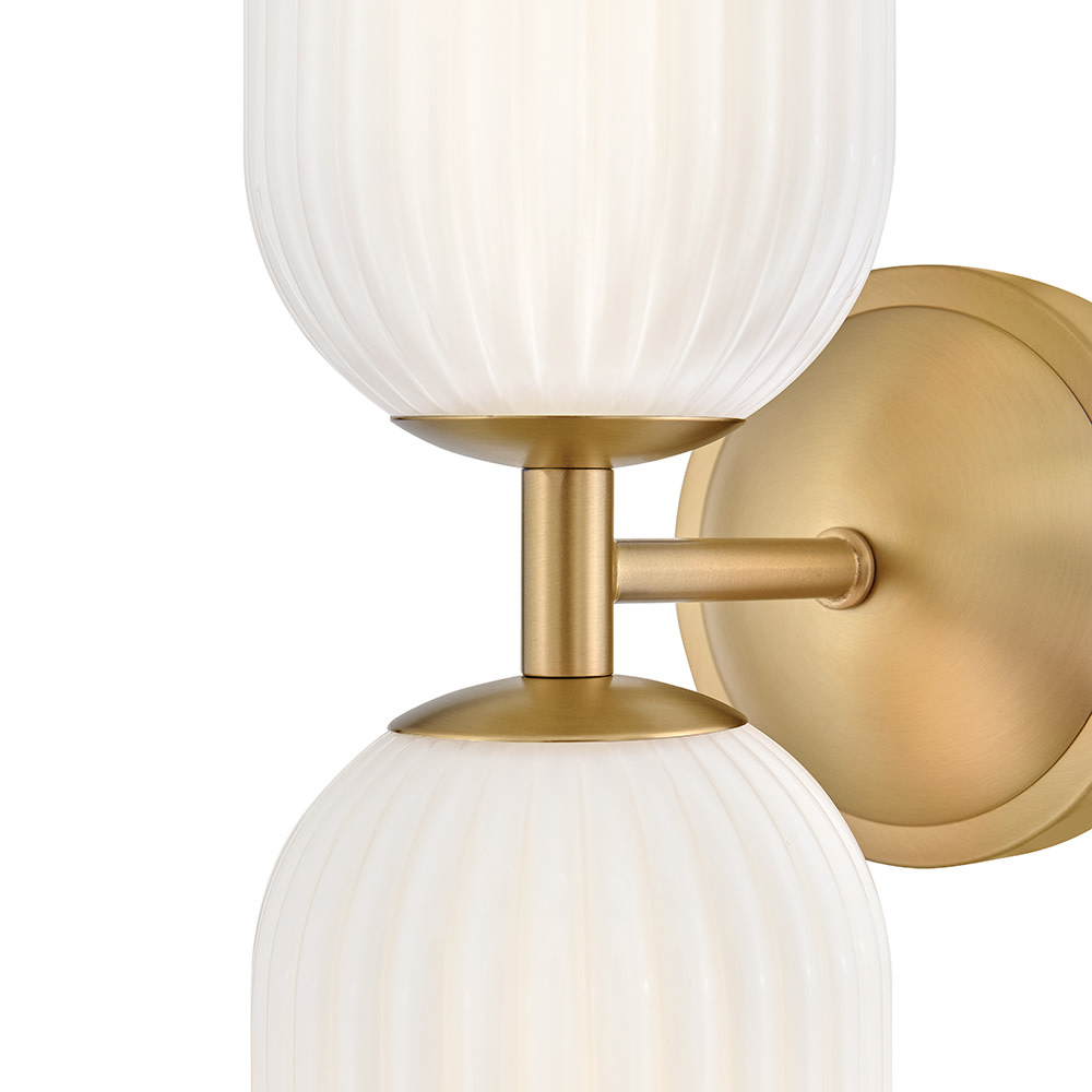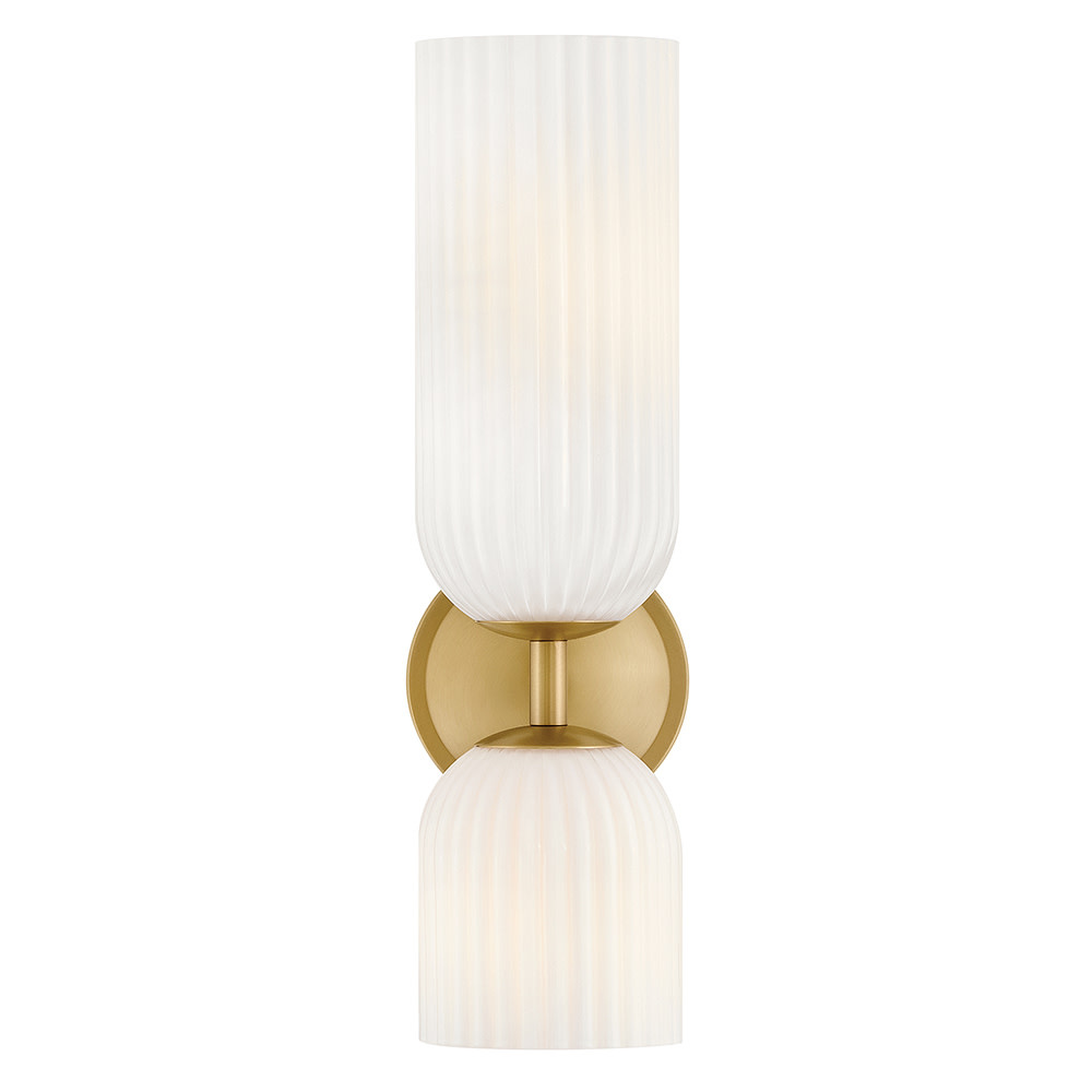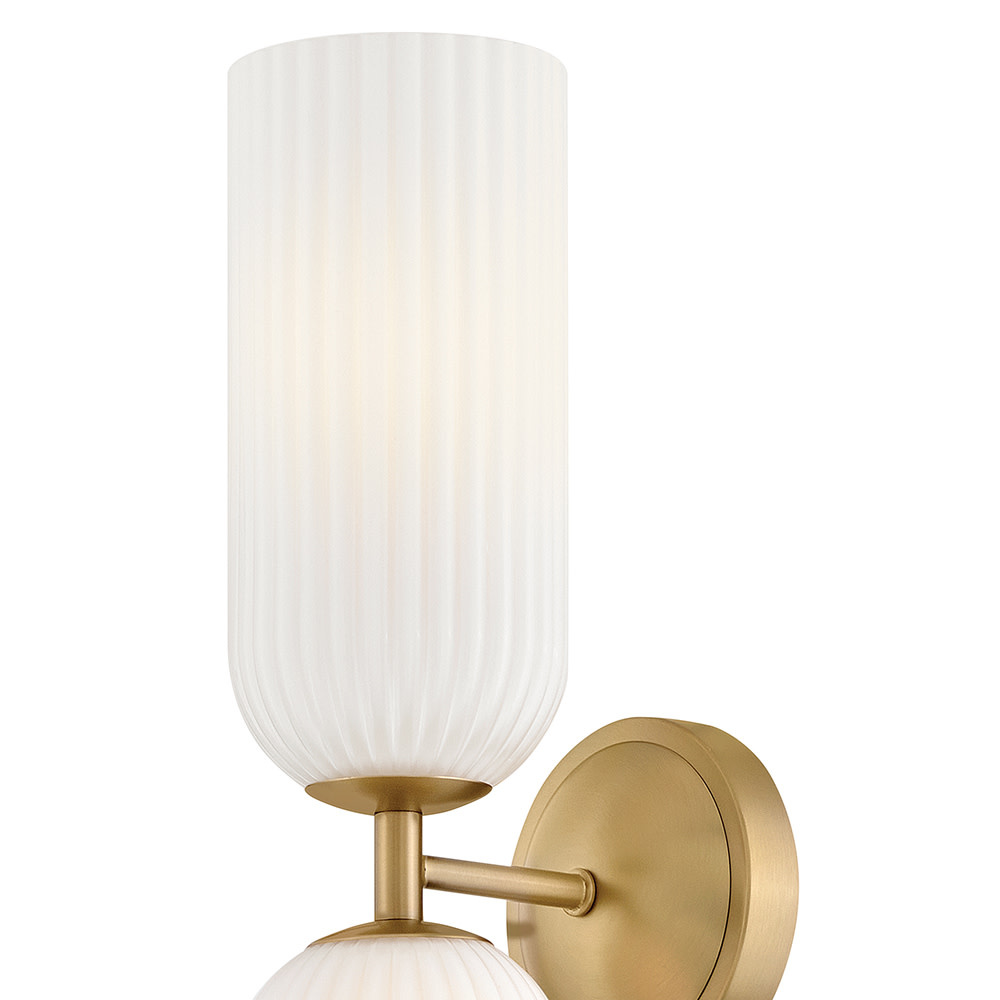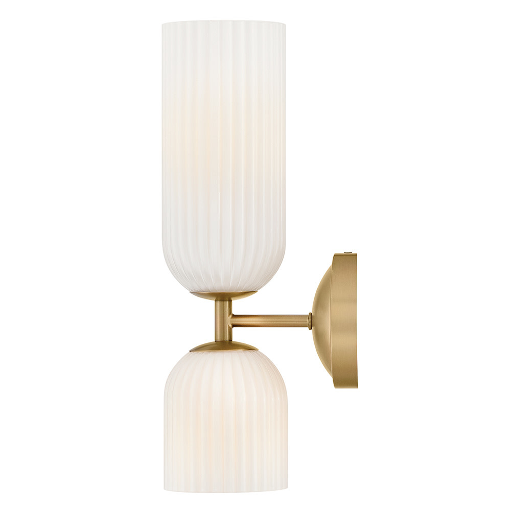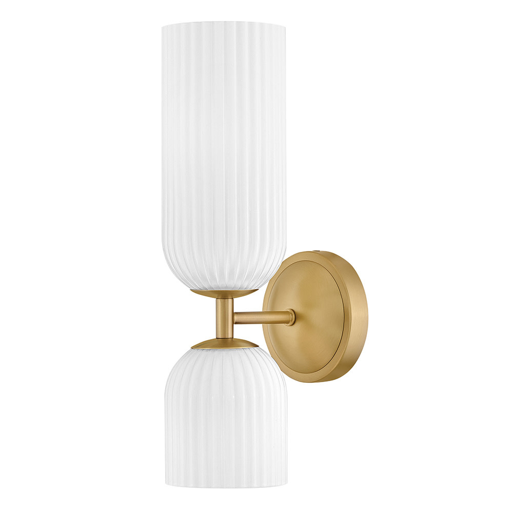 The graceful curves of Ava’s transitional ribbed glass shades are balanced by a sleek silhouette and stepped backplate. A hand-painted Lacquered Brass finish complements the Clear or Cased Opal glass with warm metallic tones, creating a timeless look that complements any decor style.