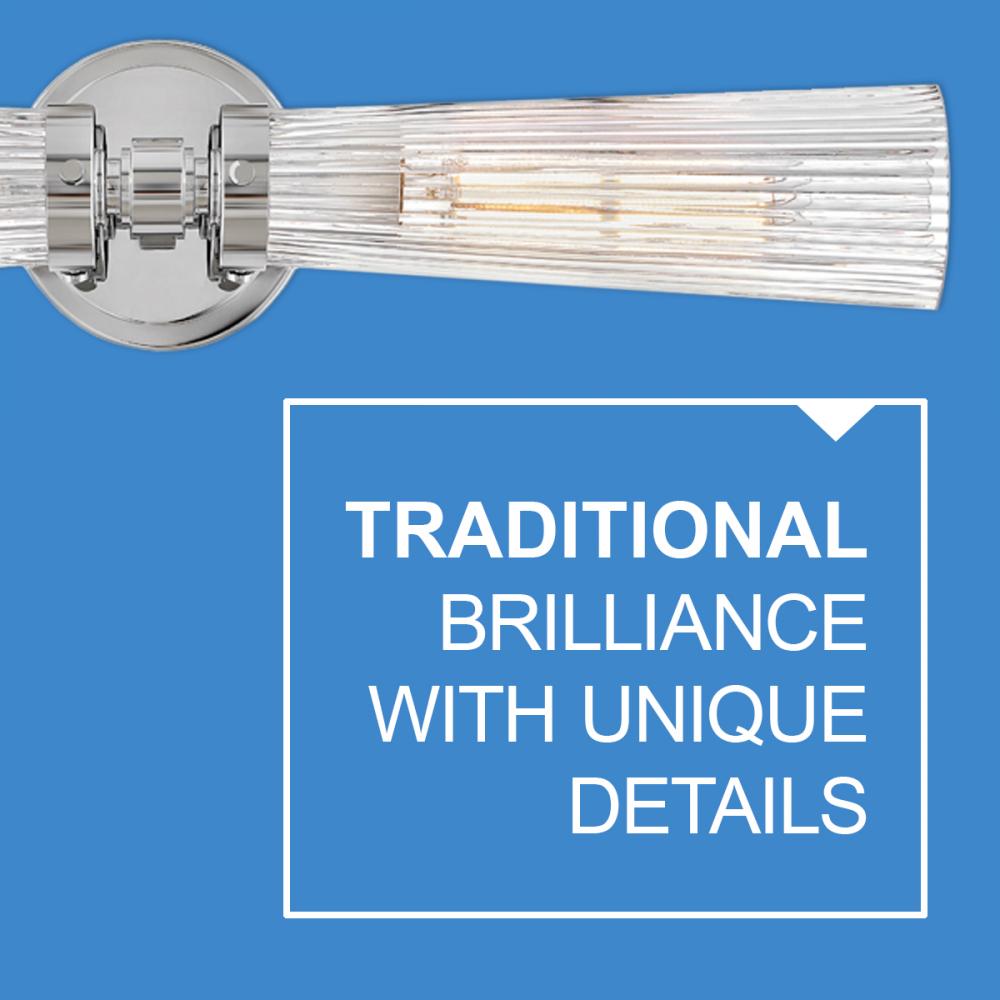 Add a dash of traditional brilliance into your every day with Jude. Featuring fluted glass held in place with decorative knobs, this family showcases timeless, traditional elegance with a unique finish. The light extends from either side, anchored in the middle for a silhouette that’s as striking as it is functional.