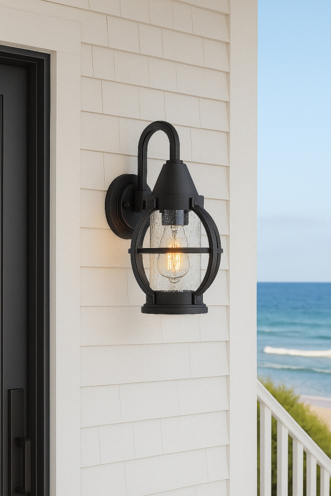 Inspired by the traditional onion-style lantern, Chatham boasts a flair of nautical charm. Featuring a refined top scroll arm for a more casual and transitional style, it encompasses a gleaming, nautical seedy glass.Chatham is designed to withstand even the harshest elements. It is available in a Museum Black finish that is resistant to rust and corrosion with a 5-year warranty.