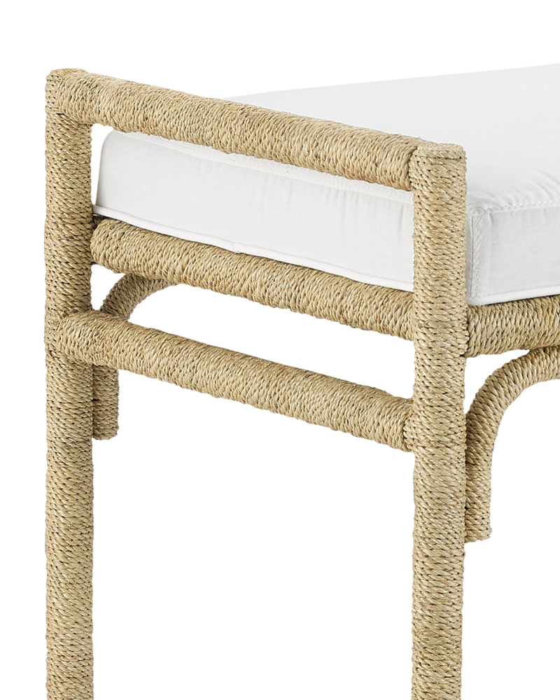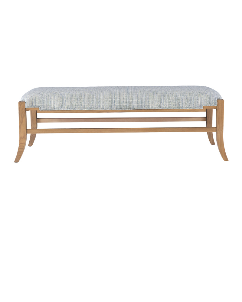 The Melanie Blonde Bench is made of ash wood in a blonde ash-wood finish; the slanting legs and the stepped details where the upholstery meets the wood on the seat are reminiscent of Greek stylistic leanings. These aspects of the bench bring it added personality. The seat is covered in a Greenlight Powder performance fabric that has a textural feel.