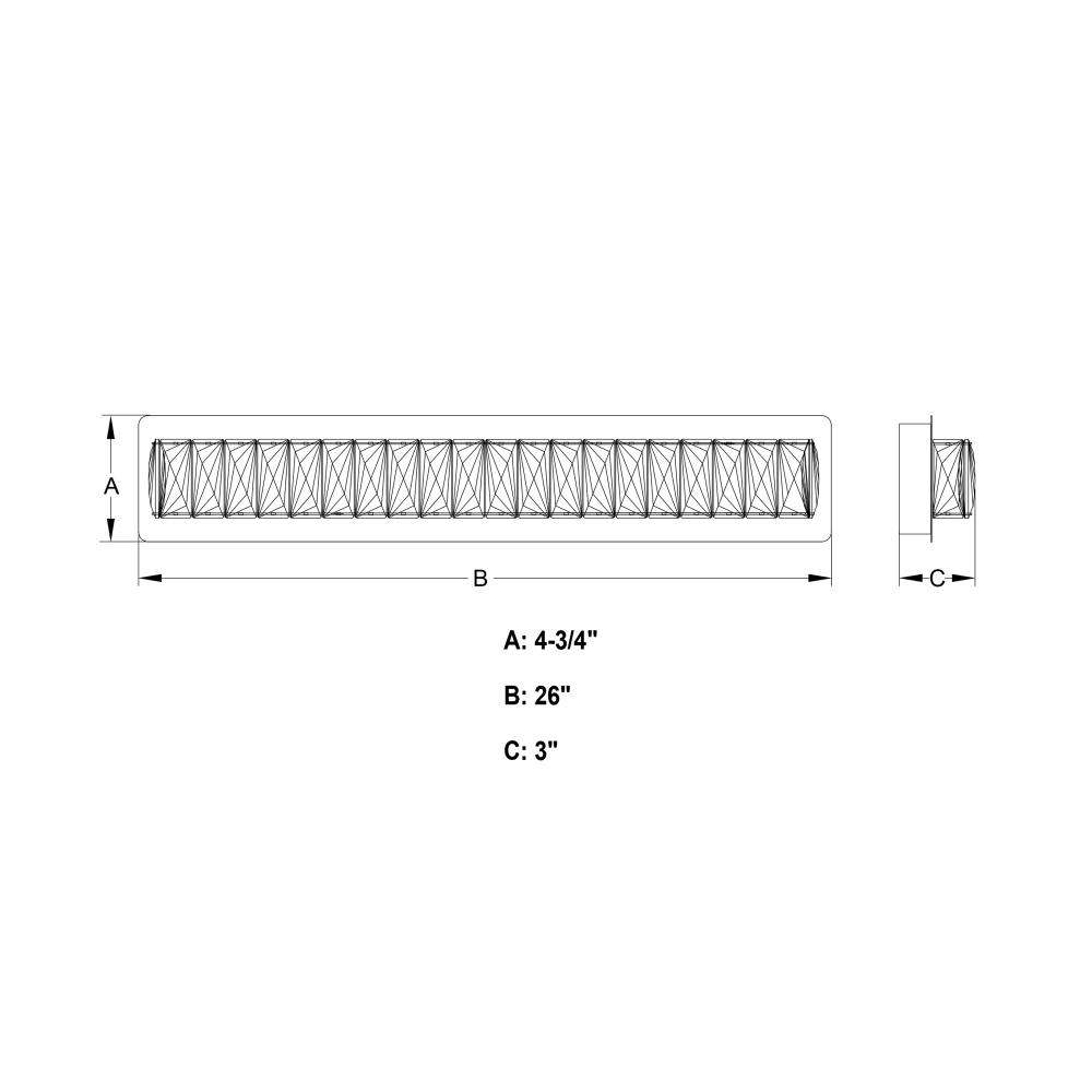 26-in W x 4.75-in H x 3-in D with 25.25-in W x 4.25-in H backplate