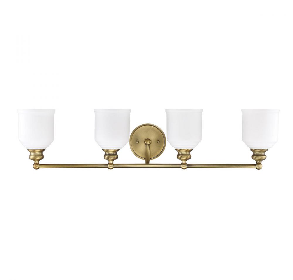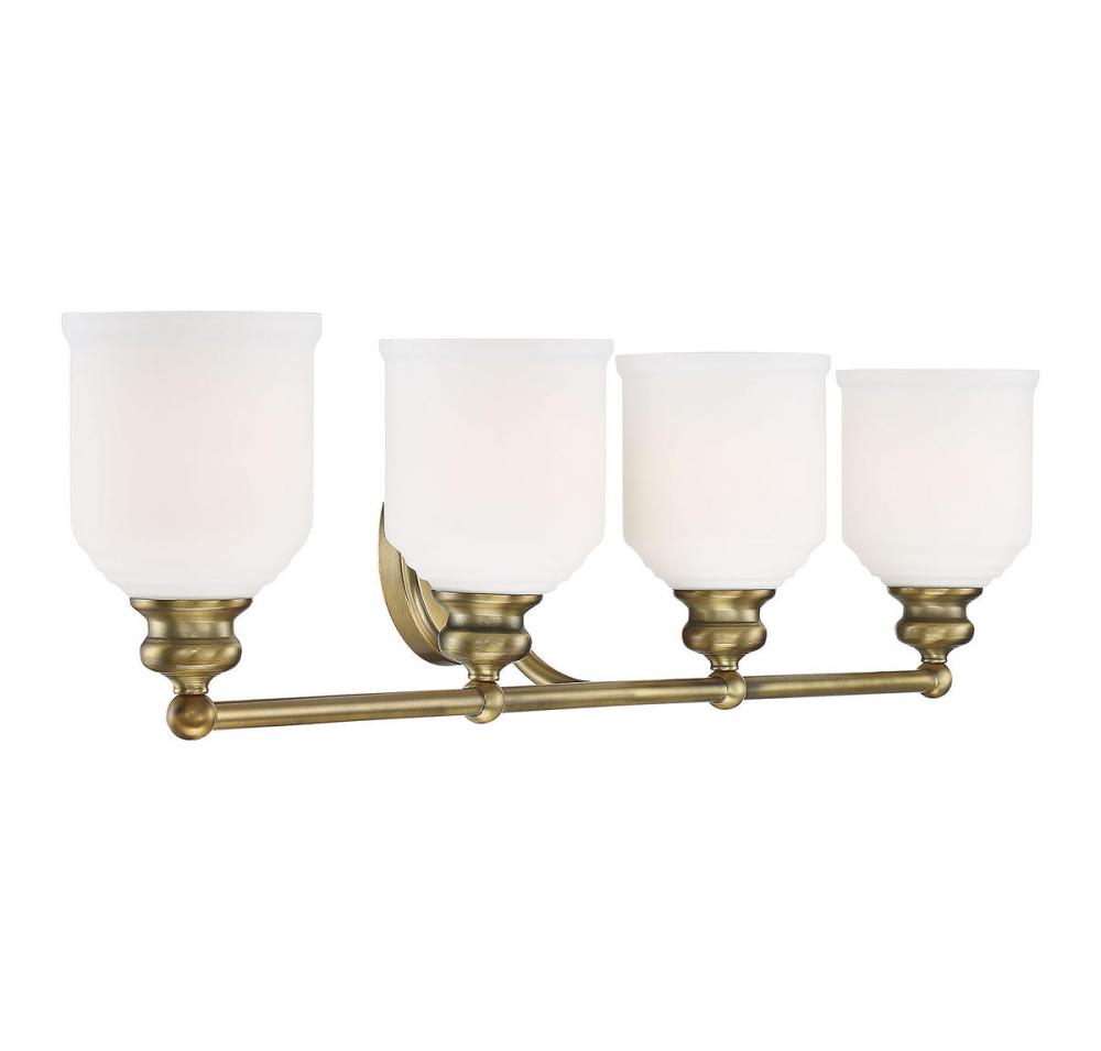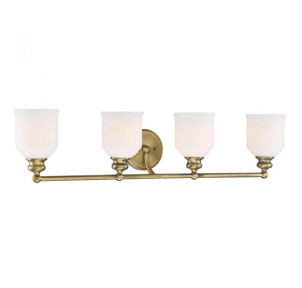 From Savoy House, the Melrose 4-light bath vanity bar stylishly updates classic Americana design for today's interiors. It features modern lines, white opal glass shades and a warm brass finish. It may be mounted as either uplight or downlight. Bath bar lights are a classic choice for illuminating vanity mirrors in bathrooms big and small. The warm brass finish can be paired with brass hardware or mixed with hardware in other finishes. Bring Melrose into bathrooms of traditional, transitional or classic style to improve the look and the lighting. When you choose a Savoy House lighting fixture, you can be certain you’ve selected a piece that will withstand the test of time.