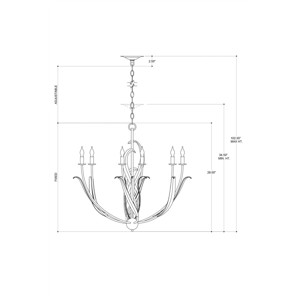 The Menefee Chandelier has swirls of long, slender leaves made of wrought iron in an antique gold leaf finish, which makes the metal gleam. This graceful gold chandelier is one of our offerings that illustrates the dexterity of our artisans, who make this resolute material feel so fluid. Adjustable from 34.5" to 102.5" with use of included chain/rod kit/cable. If your space calls for a longer drop, additional chain/rods/cable is available for purchase.