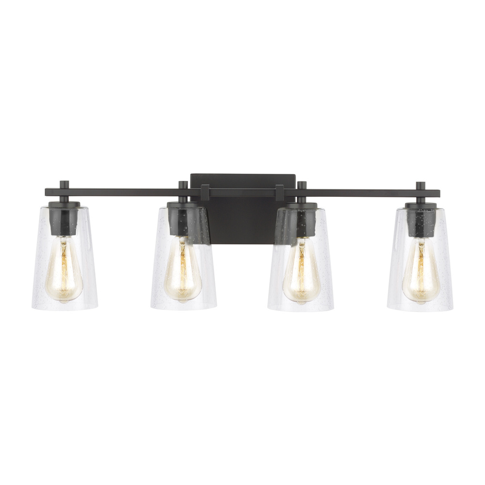 The Sean Lavin Mercer four light vanity fixture in oil rubbed bronze offers shadow-free lighting in your powder room, spa, or master bath room. Modern details, like the clean square supports of the cross arm and sleek, rectangular backplate, are defining features of the Mercer. Choose from either refreshingly bright Chrome or warm, rustic Oil Rubbed Bronze hardware for a distinct look, both with tapered Clear Seeded glass shades that complete the tailored look.