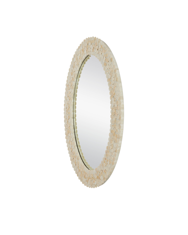 The Merriam Oval Mirror has an lovely frame fitted with over 200 hand-ground buffalo-bone discs. The color variations in the delicate bone bring this ivory decorative mirror a textural interest, while the painstaking placement of the circlets brings it a sophisticated feel. There is no bevel on the mirror.