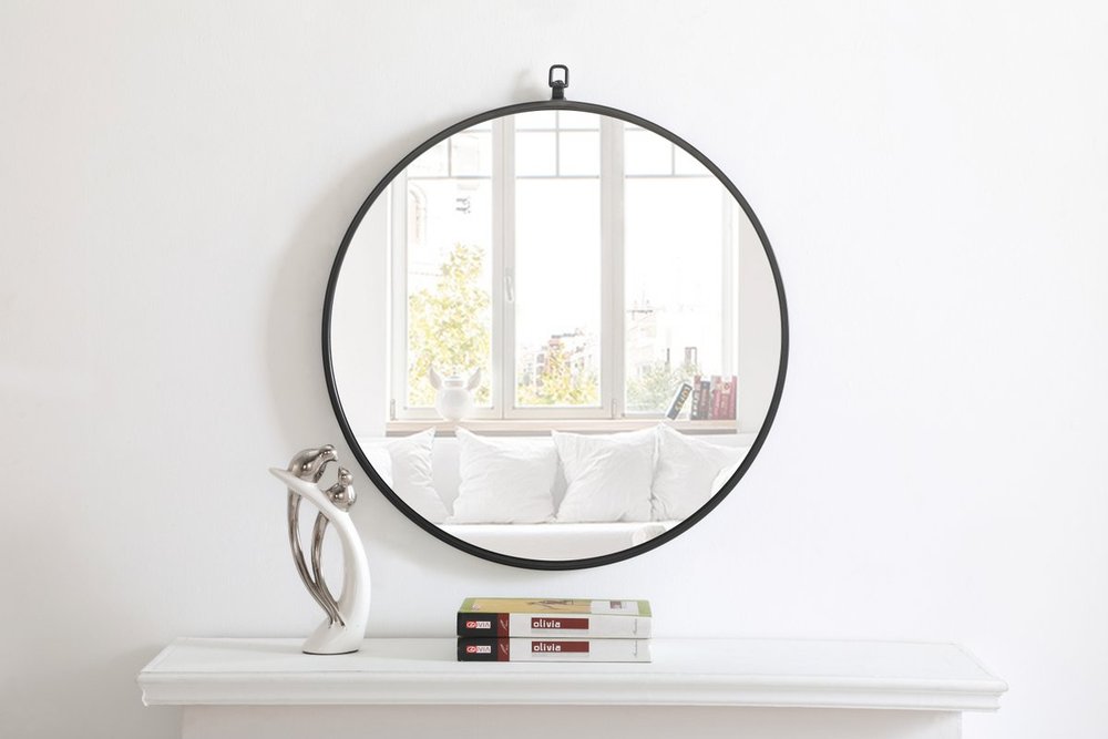 Enhance the appeal of your home or office with this black contemporary mirror featuring a thin rounded metal edges in a deep profile, reflecting a minimalist's design and trendy styling. To ensure your home safety, we use a metal hanger ring that are securely welded to the back of the metal frame , which sit on top of the frame for easy hanging. We recommend using suitable heavy duty picture/mirror hooks, selecting the best type of fixing for the particular wall you wish to hang the mirror on, using the appropriate rawl plug if required. Measurement: D24.