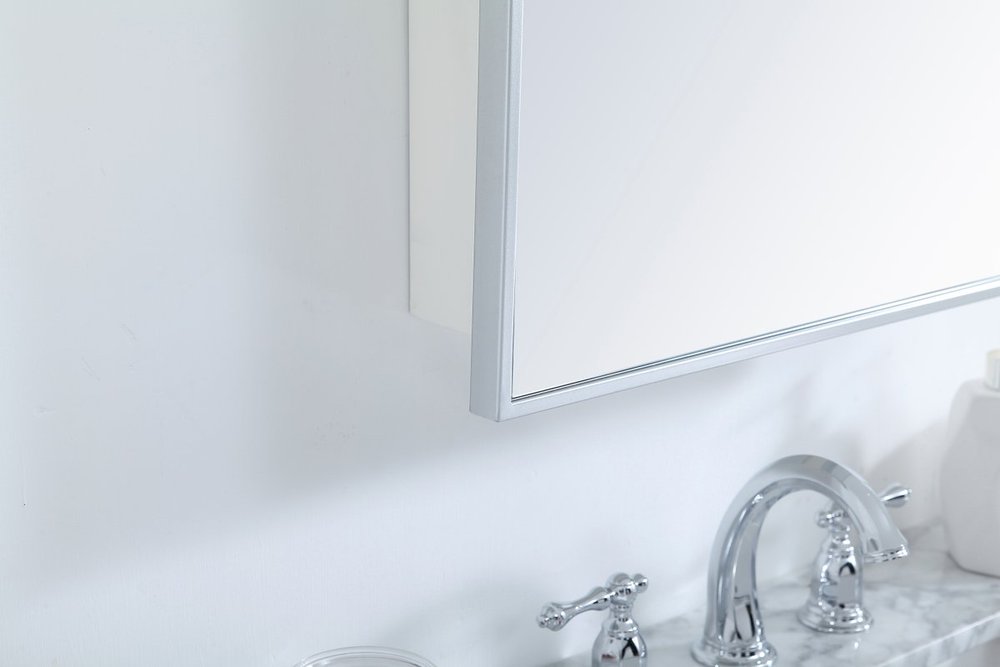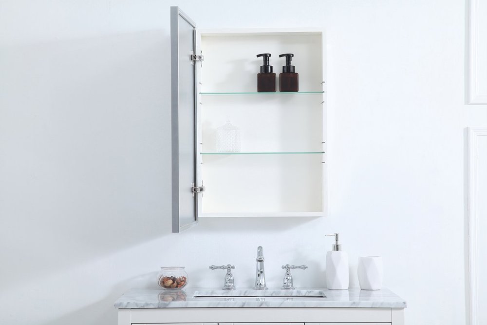 The Wyn medicine cabinet reflects a minimalist's design and trendy styling with its rust-free metal frame mirror. The classic clean and straight lines of this rectangular mirror provide you with a timeless and elegant look in your bathroom, featuring an ultra-thin metal frame in deep profile, reflecting a minimalist's design and industrial styling. Open its door to the left or right to reveal two adjustable glass shelves for storing your toiletries. There are four metal keyhole hangers installed on the back of the mirror for easy installation, mounting hardware is not included. Constructed with a manufactured wood frame for exceptional strength and durability.