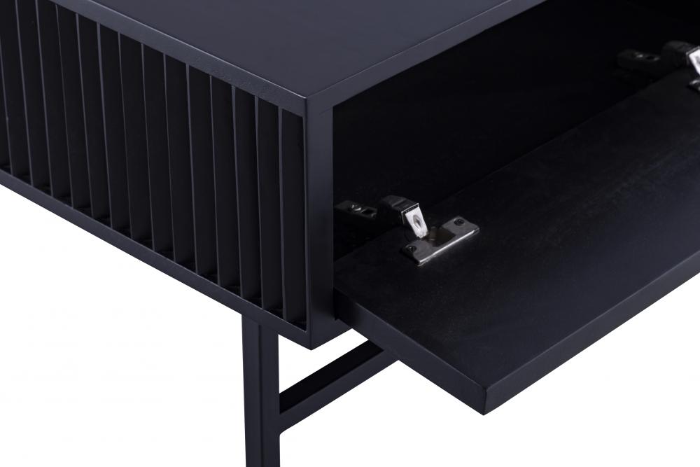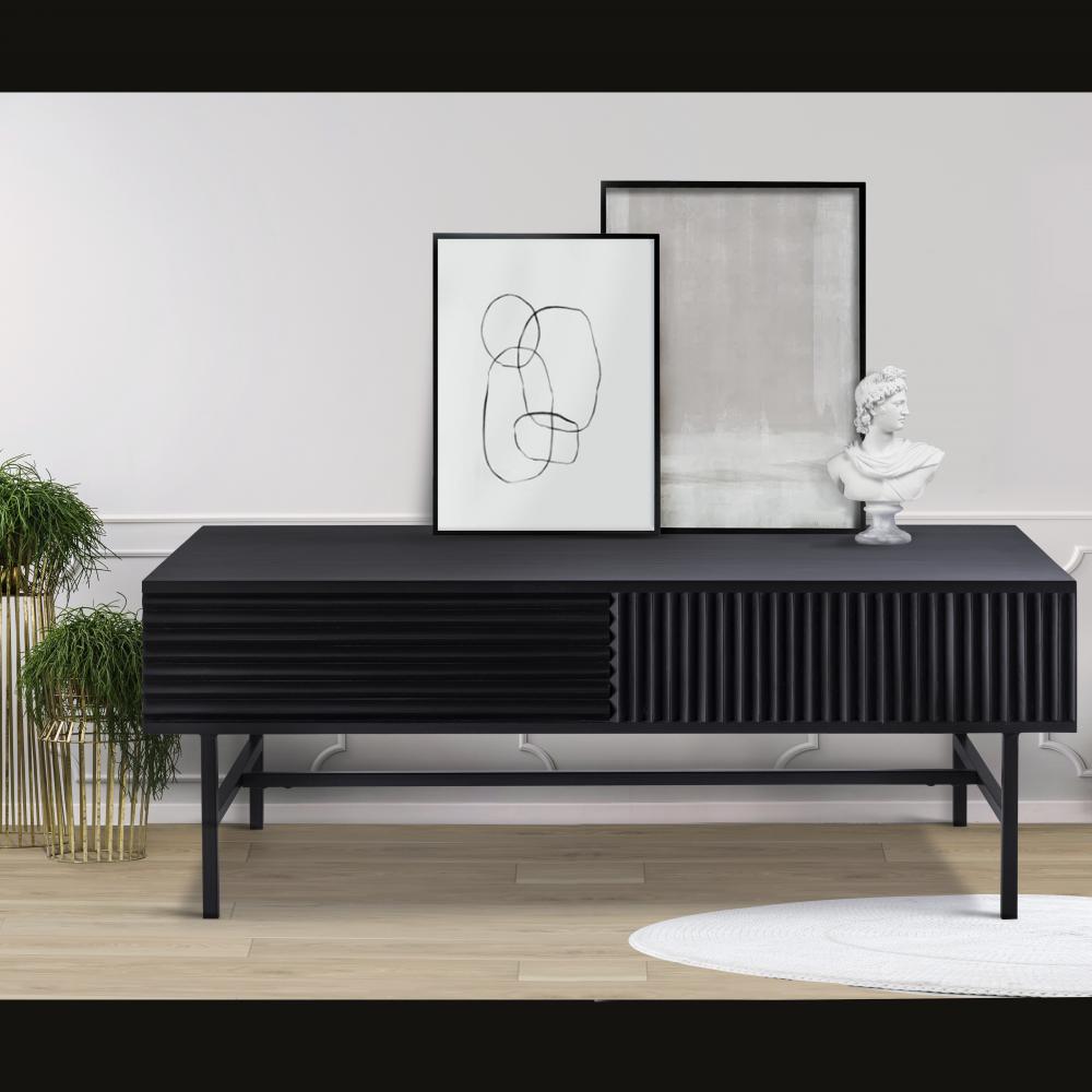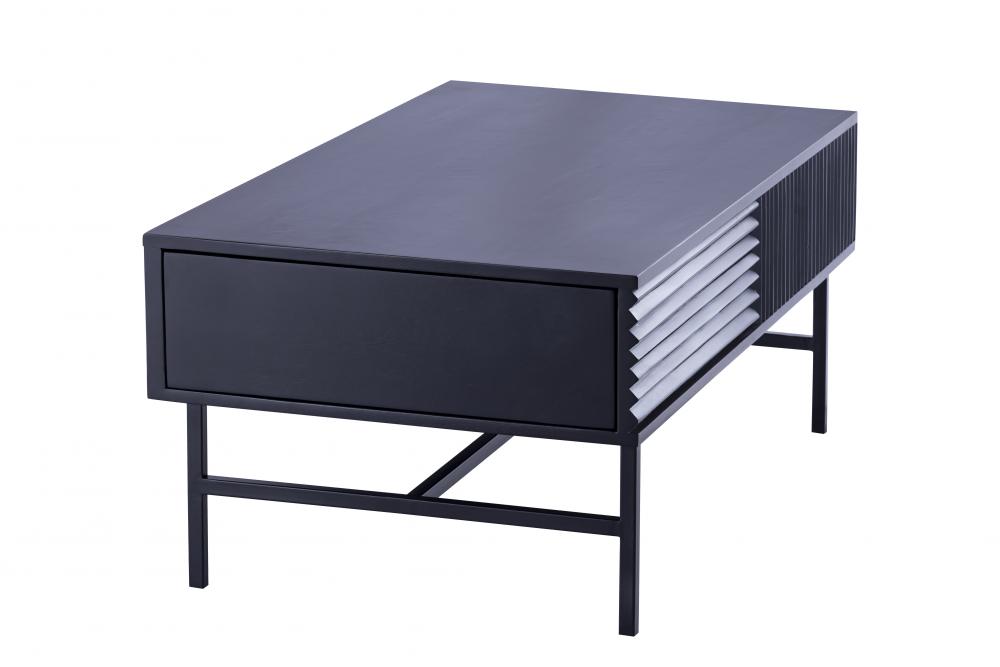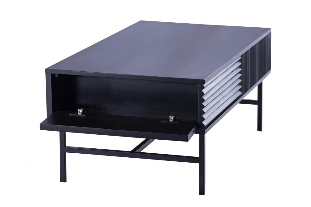 Introducing the MEZ Black Finished Coffee Table, a perfect combination of modern design and functional elegance. This coffee table features a sleek and sophisticated silhouette, crafted from high-quality iron and finished in a luxurious black. The unique ribbed design on the sides adds texture and depth, making it a striking focal point in any room.The MEZ coffee table is designed to be both visually appealing and highly functional. Its spacious top provides ample surface area for serving drinks, displaying decor items, or keeping essentials within easy reach. The hidden storage compartments offer a practical solution for keeping your living space organized and clutter-free. The versatile design allows it to seamlessly blend into various decor styles, from modern and minimalist to contemporary and industrial.With its refined aesthetic and high-quality craftsmanship, the MEZ Black Finished Coffee Table enhances any room's ambiance. Whether placed in the living room, bedroom, or office, this coffee table is sure to impress with its distinctive look and practical features.
