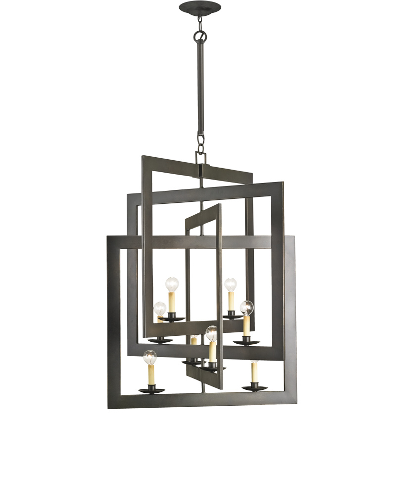 The Middleton Bronze Chandelier has interlocking squares created by wrought-iron bands that are smartly designed. The frame of this eight-light chandelier perfects the illusion of diminishing perspective, its bronze gold finish bringing it warmth. Adjustable from 56" to 115" with use of included chain/rod kit/cable. If your space calls for a longer drop, additional chain/rods/cable is available for purchase.