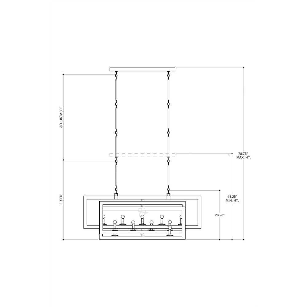 Our Middleton Rectangular Silver Chandelier has interlocking rectangles created by wrought-iron bands that are smartly designed. The frame of this chandelier perfects the illusion of diminishing perspective, its contemporary silver leaf finish making it gleam. Adjustable from 41.25" to 78.75" with use of included chain/rod kit/cable. If your space calls for a longer drop, additional chain/rods/cable is available for purchase.
