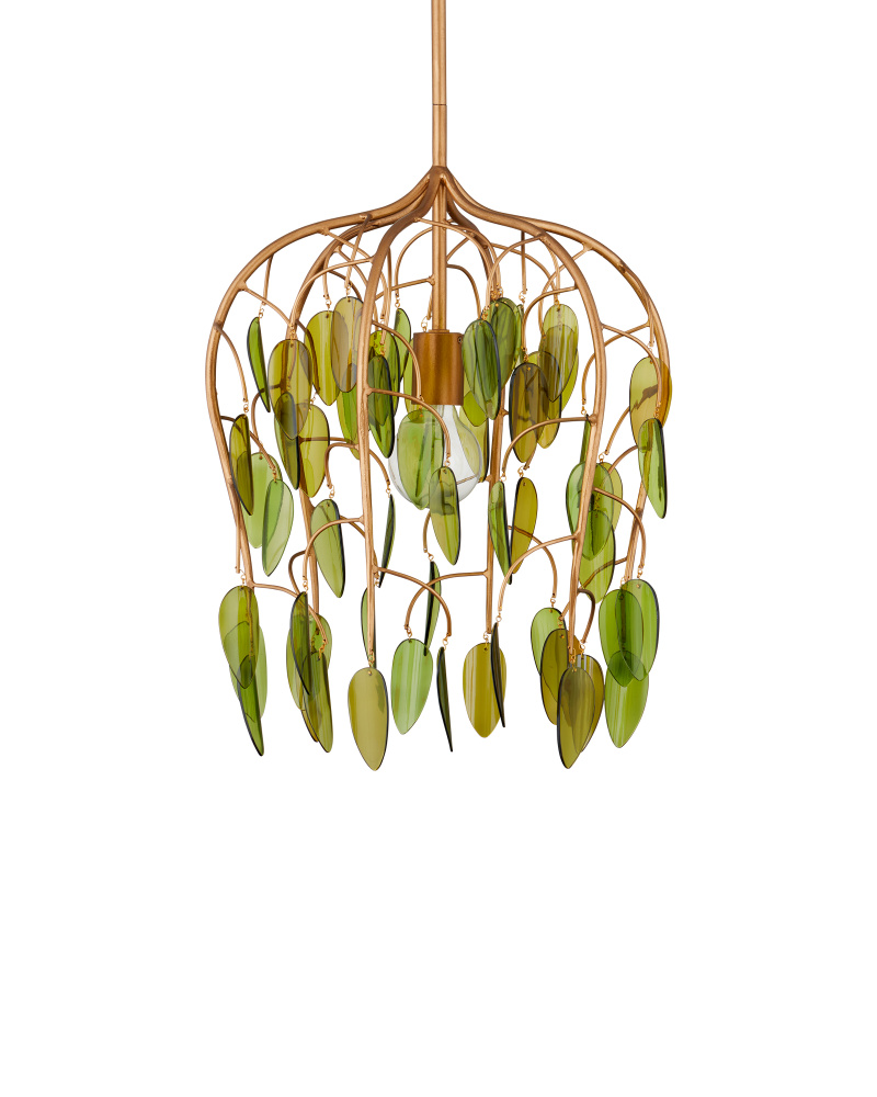 As lovely as a dangling blossom that calls to mind a balmy evening, the Midsummer Pendant blooms with artistry. A wrought iron frame that tapers from a clean-lined rod to thin tendrils as it graduates toward the bottom dangles curved petals made of recycled glass. The green and amber pieces retain the original colors of the beverage bottles from which they were taken. Because this fixture is artisanal, the configuration of the glass colors will vary slightly, which makes each green and gold pendant unique. Adjustable from 25" to 67" with use of included chain/rod kit/cable. If your space calls for a longer drop, additional chain/rods/cable is available for purchase.