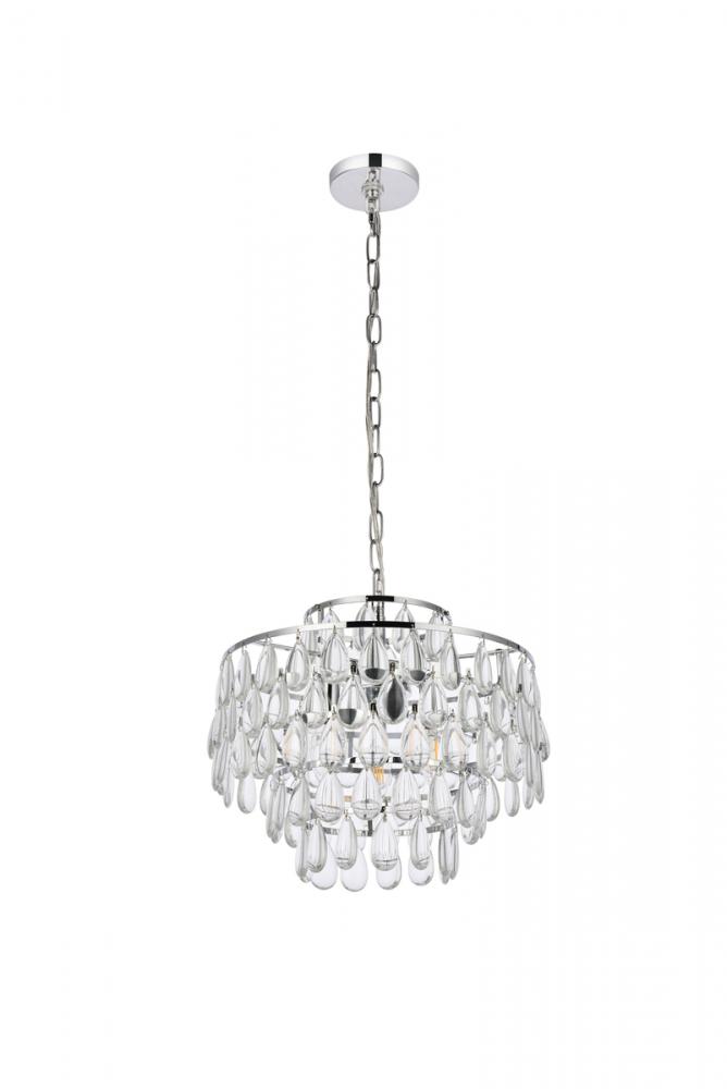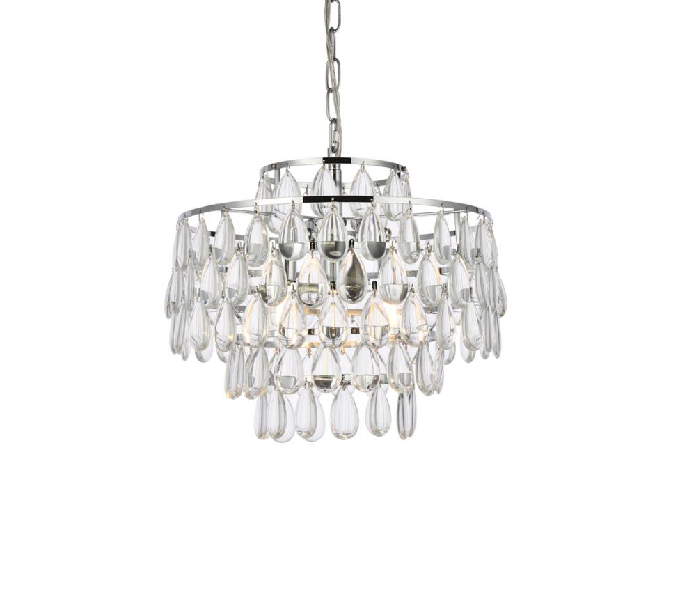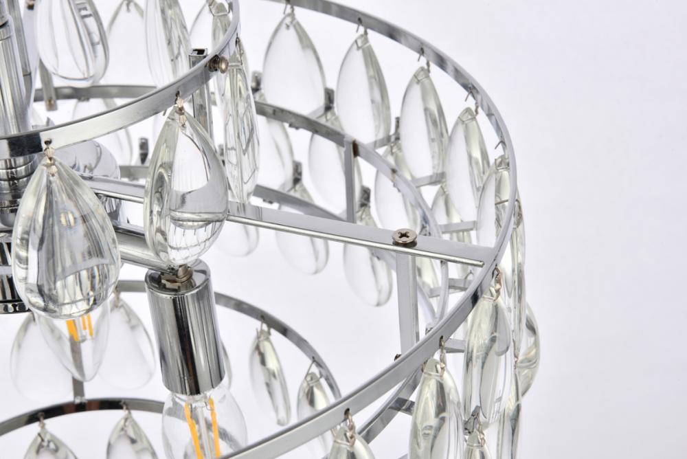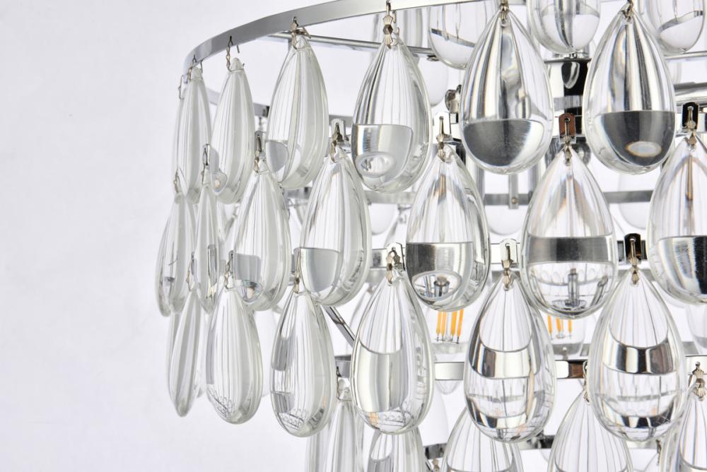 Tiers of clear smooth almond shaped crystals reflect the soft glow of candelabra bulbs