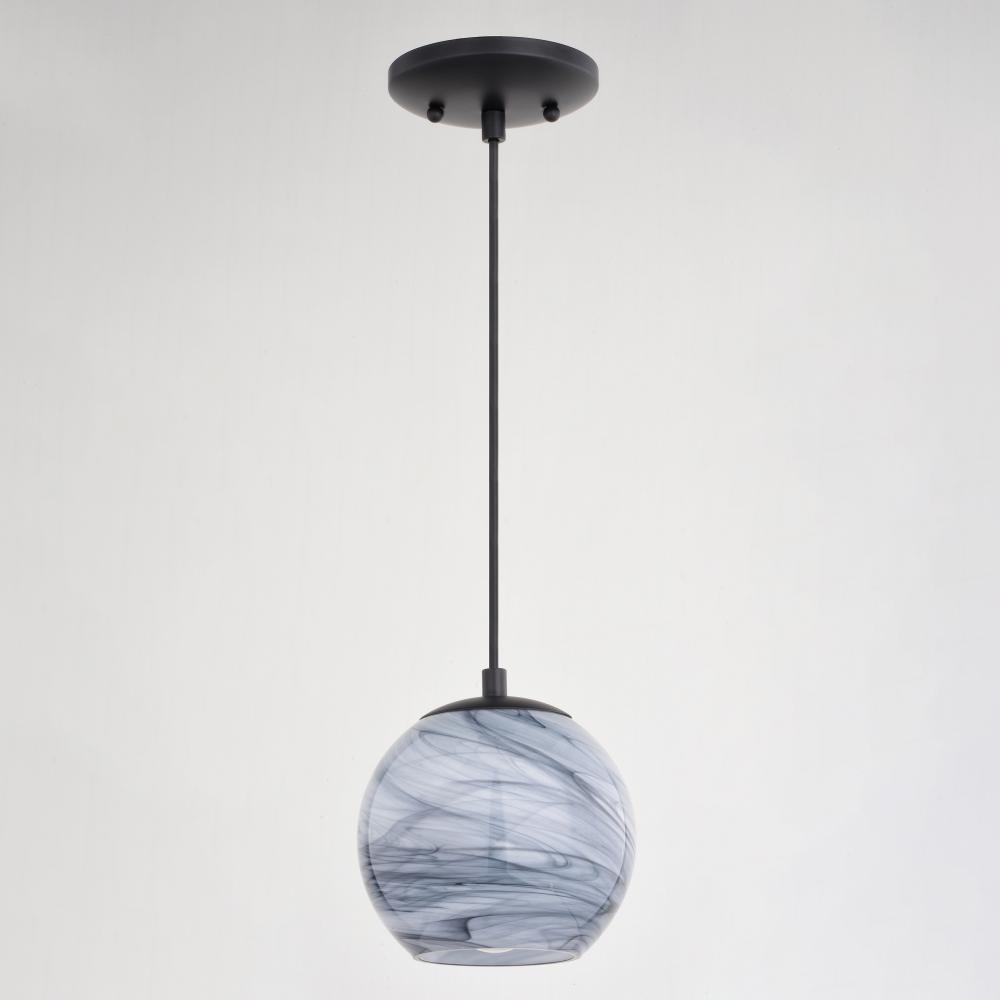 The Milano collection of art glass mini pendant lights feature hand-blown glass which gracefully blend into almost any decor. Because each glass is handcrafted utilizing century-old techniques, no two pieces are identical. The marble swirl colored glass has tones of gray and silver in a rounded globe shape. Accented in an artistic matte black finish with matching black cord which can be cut to size to adjust the hanging height. Install this mini pendant individually or in a grouping; ideal for kitchens, dining areas, or bar areas.