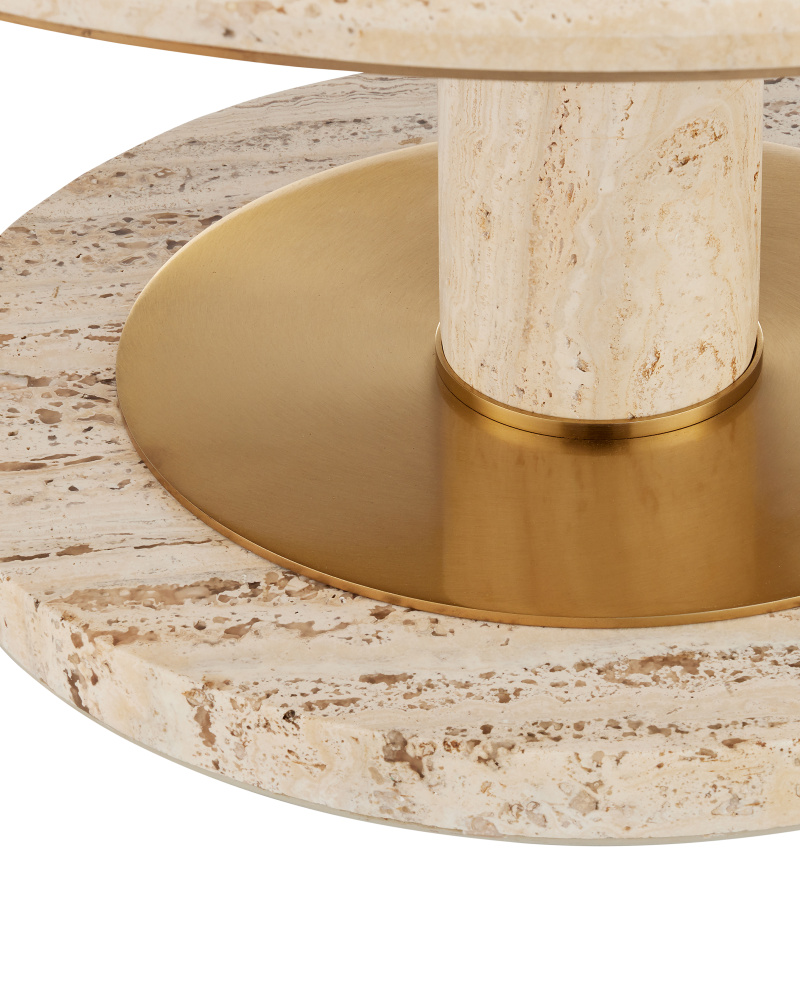 Made of travertine and brass in a polished brass finish, the Miles Travertine Accent Table has a telescoping personality. The interplay of metal and stone is a sophisticated aspect of this design, as the travertine column at the bottom has been drilled so the metal slices through it. The warmth of the finish on the metal draws out the darker veining in the natural material.