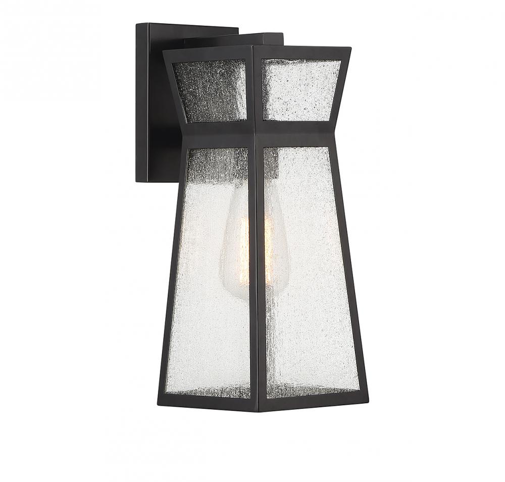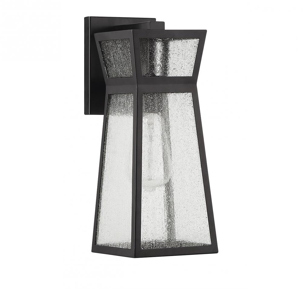 From Savoy House, the Millford 1-light outdoor wall light showcases a more contemporary take on classic lantern-style illumination with a sharply angular shape and panes of seedy glass. Matte black finish. Millford is 14" in height, 5.5" in width and extends 7" from the wall. It uses 1 standard size bulb with a max of 60 watts (bulb not included).