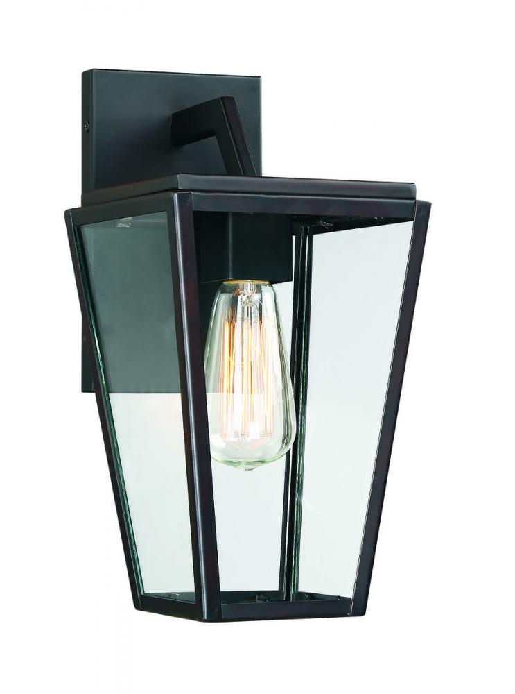 Sleek, contemporary, and welcoming light is all yours with the Milton outdoor wall lantern. It’s a fresh, modern take on a classic, tapered-box lantern, with clean lines and an angular, geometric silhouette. The streamlined frame has a rich, dark, English bronze finish, and pristine, clear glass panes. It’s an impeccable complement to other hardware and materials on the exterior of your home. Within the lantern panels, one 60W, E-style bulb illuminates the area —and this fixture is UL rated for damp locations, too. It measures 6.5” wide and 13” high, extending 8” from the wall: perfect to add chic lighting to the walls of your patio, porch, sunroom, or other covered outdoor living areas.