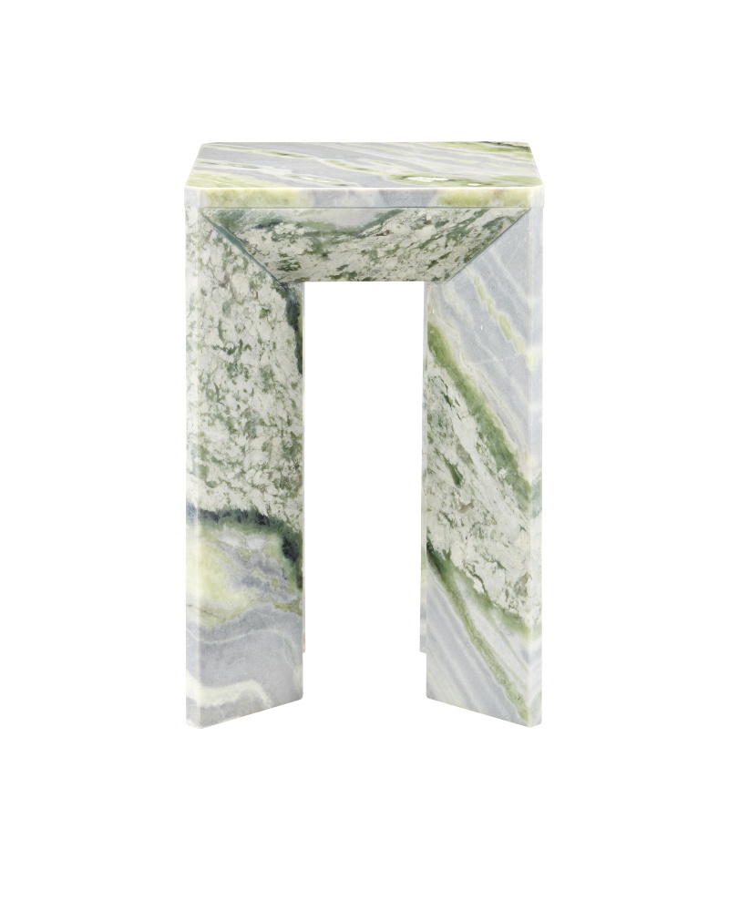 The Minerale Green Onyx Accent Table exhibits natural beauty and refined craftsmanship. Made from richly patterned green onyx, striking veins of green, gray, and beige flow along its surfaces to make each table unique. The square table has an angular design with a chamfered top that descends into a well-defined apron, a receding quality that is mirrored by its legs. At 21 inches tall, the marble table will add significant texture to its spot in a room.