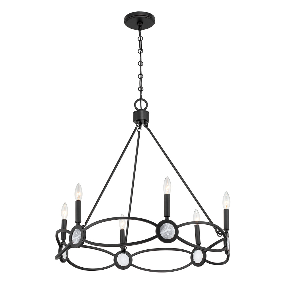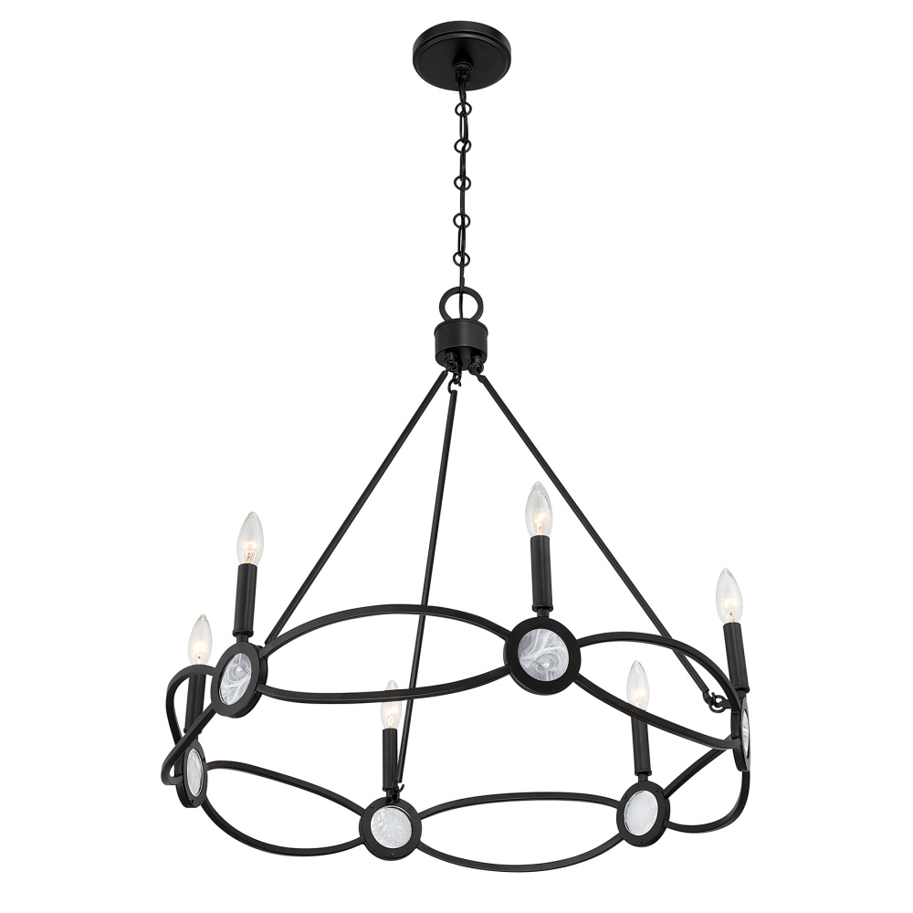 The Savoy House Minette 6-light chandelier brings sculptural sophistication to your space. Disks of luminous strie glass fan outward like stylized petals, creating a centerpiece that feels both modern and timeless. The Matte Black finish anchors the design with bold contrast. Minette is 27.25" high and 28" wide. It uses six candelabra size bulbs of up to 60 watts per bulb. Bulbs not included. Comes with 120" of chain.